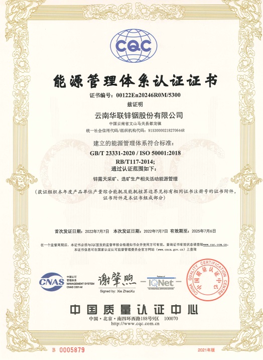 華聯鋅銦公司于2021年下旬啟動能源管理體系認證工作,前期邀請專家培訓相關標準、法規,隨后開始準備一系列申報材料,于2022年6月組織開展能源管理體系外部審核工作,由中國檢驗認證集團云南有限公司相關專家組進行評審并一致通過,隨后審核專家將申報材料與過程審核資料上傳至中國質量認證中心進行監督評審。經過層層審核與改進公司能源管理體系建設最終通過評審,并由中國質量認證中心頒發證書。
