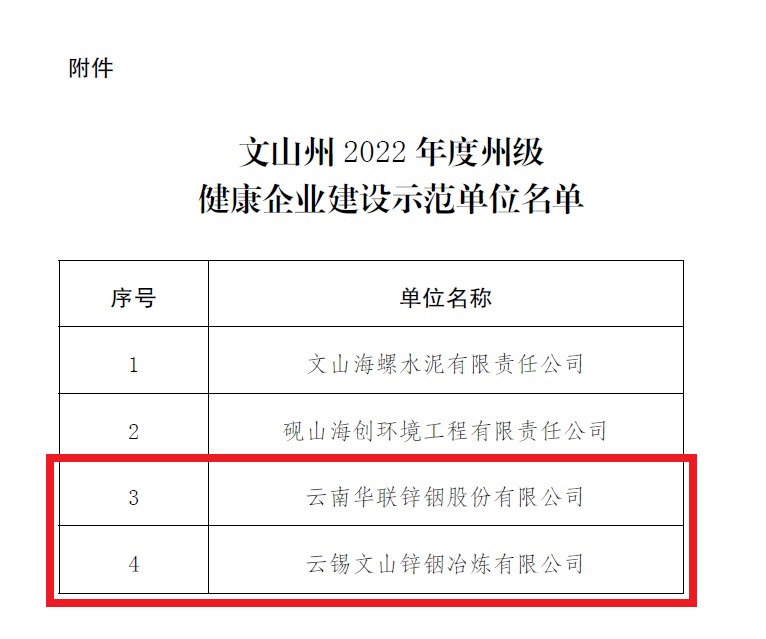 近日,健康文山行動推進委員會辦公室下發了《健康文山行動推進委員會辦公室關于命名2022年度“州級健康企業建設示范單位”的通知》,云錫文山兩公司名列其中。