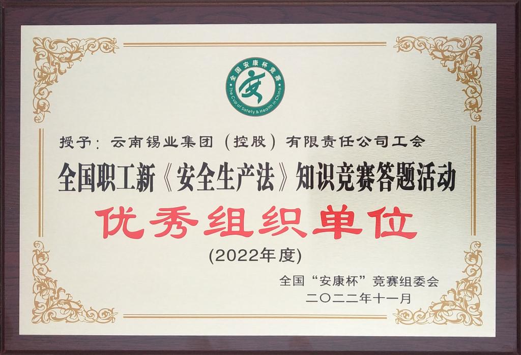 經云南省總工會推薦,全國“安康杯”競賽組委會審核,控股公司工會獲全國職工新《安全生產法》知識競賽答題“優秀組織單位”榮譽稱號,是云南省的7個獲獎單位之一,是云南省屬企業工會中的唯一獲獎單位。另外,錫化工公司職工袁龍飛榮獲知識競賽答題活動個人“二等獎”。