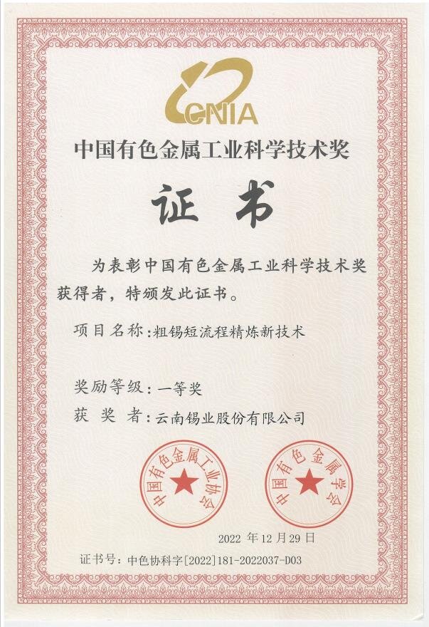 近日,中國有色金屬工業(yè)協(xié)會(huì)、中國有色金屬學(xué)會(huì)發(fā)布了榮獲2022年度中國有色金屬工業(yè)科學(xué)技術(shù)獎(jiǎng)項(xiàng)目,由云錫控股公司牽頭負(fù)責(zé),錫業(yè)股份錫業(yè)分公司、昆明理工大學(xué)、綠地環(huán)保共同參與的“粗錫短流程精煉新技術(shù)項(xiàng)目”榮獲2022年度“中國有色金屬工業(yè)科學(xué)技術(shù)獎(jiǎng)一等獎(jiǎng)”。