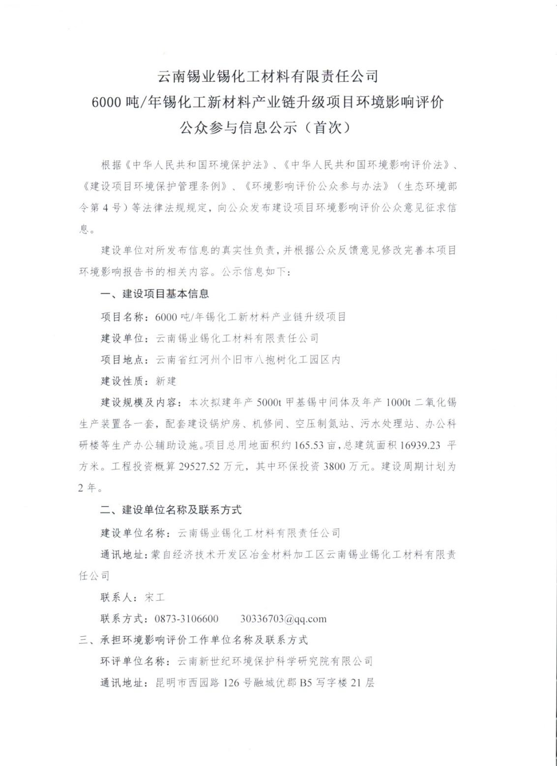 云南錫業錫化工材料有限責任公司6000噸/年錫化工新材料產業鏈升級項目環境影響評價公眾參與信息公示(首次)