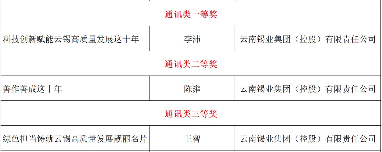 近日,由中國有色金屬報社主辦、西南鋁業(yè)(集團)有限責任公司(以下簡稱西南鋁)協(xié)辦的2023年全國有色金屬企業(yè)全媒體好新聞評選會在重慶市召開。通過評審,云錫控股公司李沛撰寫的《科技創(chuàng)新賦能云錫高質(zhì)量發(fā)展這十年》榮獲通訊類一等獎,陳雍撰寫的《善作善成這十年》榮獲通訊類二等獎,王智撰寫的《綠色擔當鑄就云錫高質(zhì)量發(fā)展靚麗名片》榮獲通訊類三等獎。
