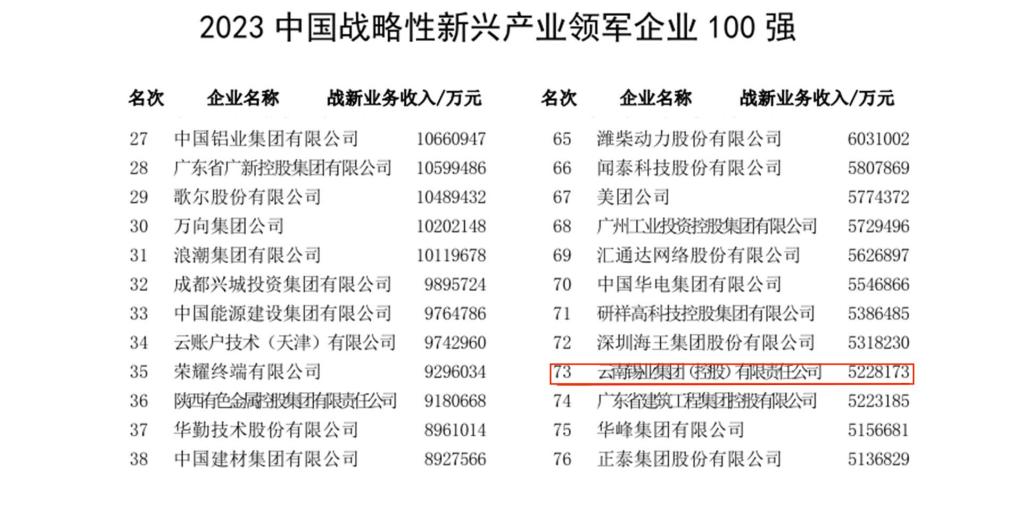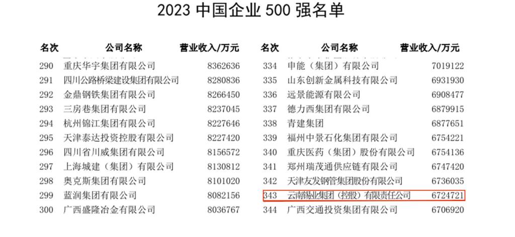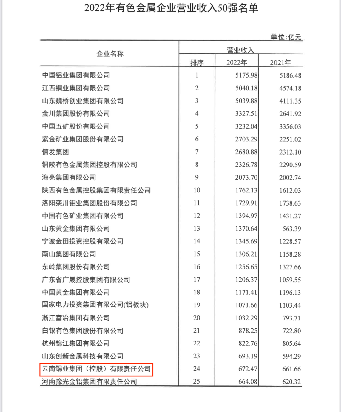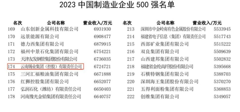 近日,中國(guó)企業(yè)聯(lián)合會(huì)、中國(guó)企業(yè)家協(xié)會(huì)聯(lián)合發(fā)布“2023中國(guó)企業(yè)500強(qiáng)”榜單。云錫位列2023年中國(guó)企業(yè)500強(qiáng)第343位,中國(guó)制造業(yè)企業(yè)500強(qiáng)第174位,中國(guó)戰(zhàn)略性新興產(chǎn)業(yè)領(lǐng)軍企業(yè)100強(qiáng)73位。在中國(guó)有色金屬工業(yè)協(xié)會(huì)發(fā)布的2022年有色金屬企業(yè)50強(qiáng)榜單中,云錫位列第24位。