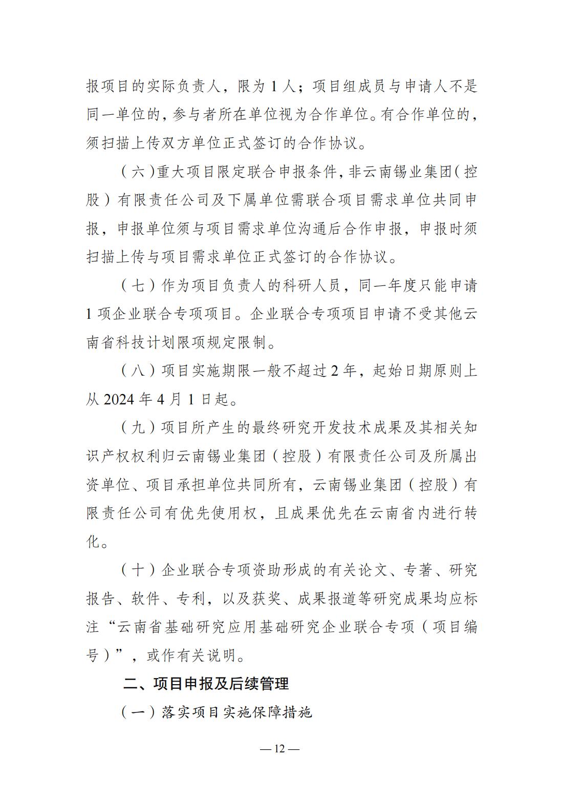 關于發布云南省科學技術廳 云南錫業集團(控股)有限責任公司基礎研究應用基礎研究企業聯合專項2024年度項目申報指南的通知