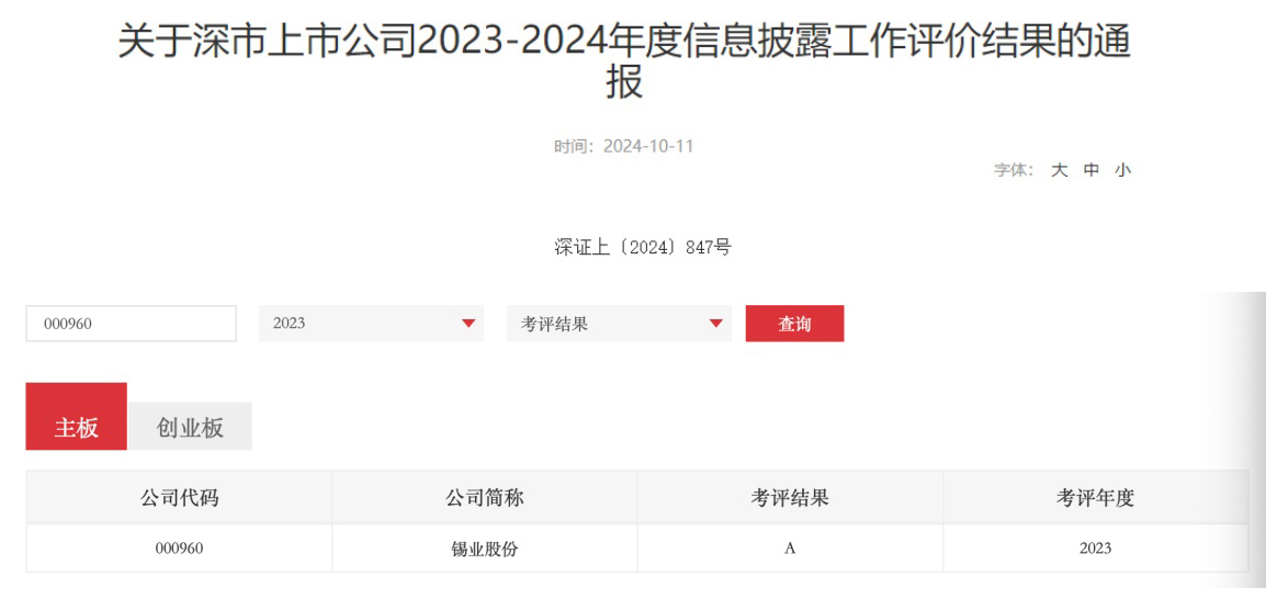 10月11日,深圳證券交易所發(fā)布《關(guān)于深市上市公司2023-2024年度信息披露工作評價結(jié)果的通報》,錫業(yè)股份(000960)考核評價結(jié)果為最高等級A級。從評價結(jié)果統(tǒng)計來看,深市上市的2810家公司中,評價結(jié)果為A(優(yōu)秀)的公司僅為487家,占參加評價上市公司總數(shù)的17.33%。其中,云南轄區(qū)評價結(jié)果為A的深市上市公司僅有6家。