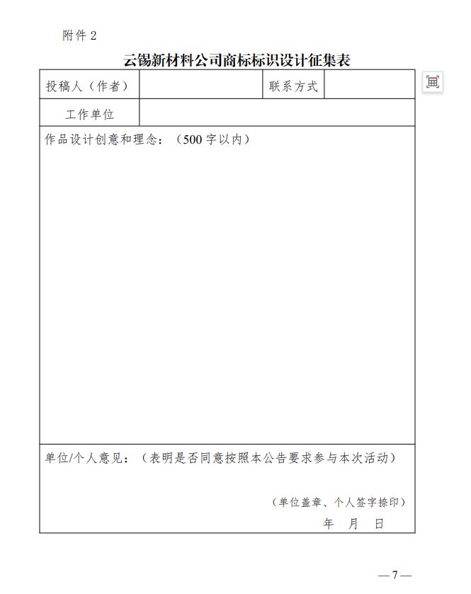 (六)投稿時須一并提交附件2《云錫新材料公司商標標識設計征集表》和附件3《不可撤銷的合規、保密、廉潔承諾書》,缺少任何一項視為無效投稿。以組織名義投稿的需提交投稿組織的營業執照復印件,以個人投稿的需提交投稿個人的身份證復印件。