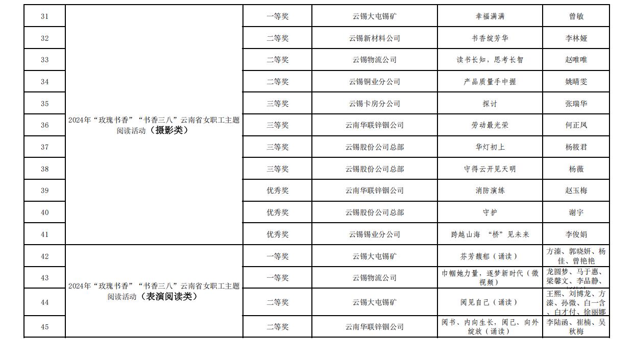 本次活動于2023年12月1日在北京啟動,至2024年8月31日讀書活動作品征集結束,全國共有31個省市、22000多家單位、1100多萬女性朋友參與。組委會共收到各地工會推薦參評作品108989件,其中征文作品53876篇、家書作品30218篇,攝影作品10250件,表演閱讀作品2998件,書畫閱讀作品11647幅(組)。組委會組織相關領域的專家對全部作品進行了初評、復評和終評。大屯錫礦楊雅荃家書類作品《寄往天堂的家書》獲二等獎;物流有限公司袁璐征文類作品《錫緣》獲三等獎;大屯錫礦表演閱讀類作品《芬芳馥郁》獲三等獎。此外,華聯(lián)鋅銦公司劉自香征文類作品《閱讀,遇見更好的自己》、銅業(yè)分公司蔡晴家書類作品《隔年家書傳家風,伉儷情深聚云錫》、新材料公司蘇海濤書畫閱讀類作品《“精”幗工匠 “錫”引未來》等7篇(件)作品獲優(yōu)秀獎。