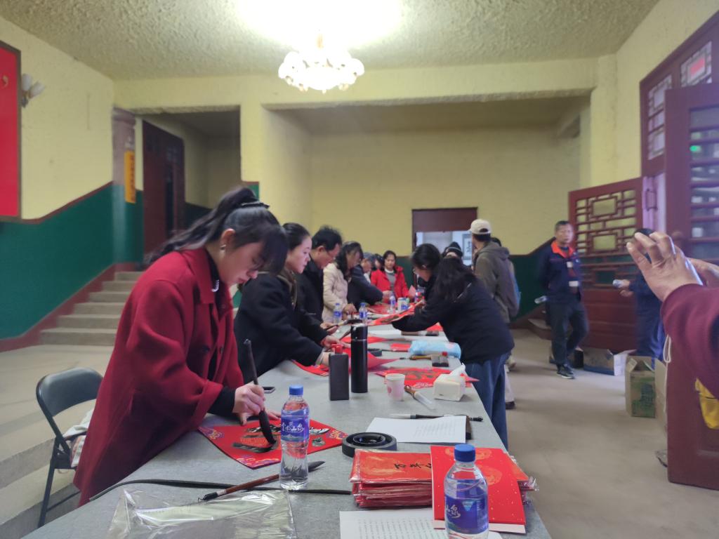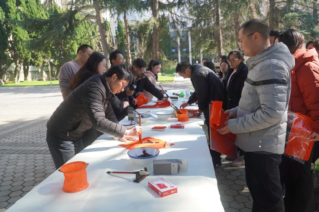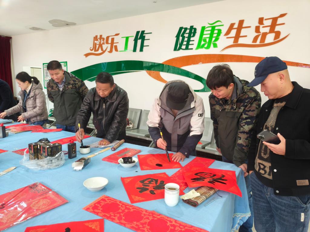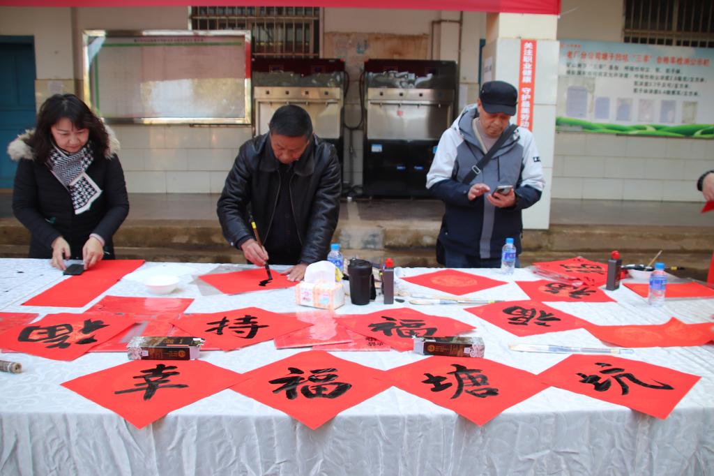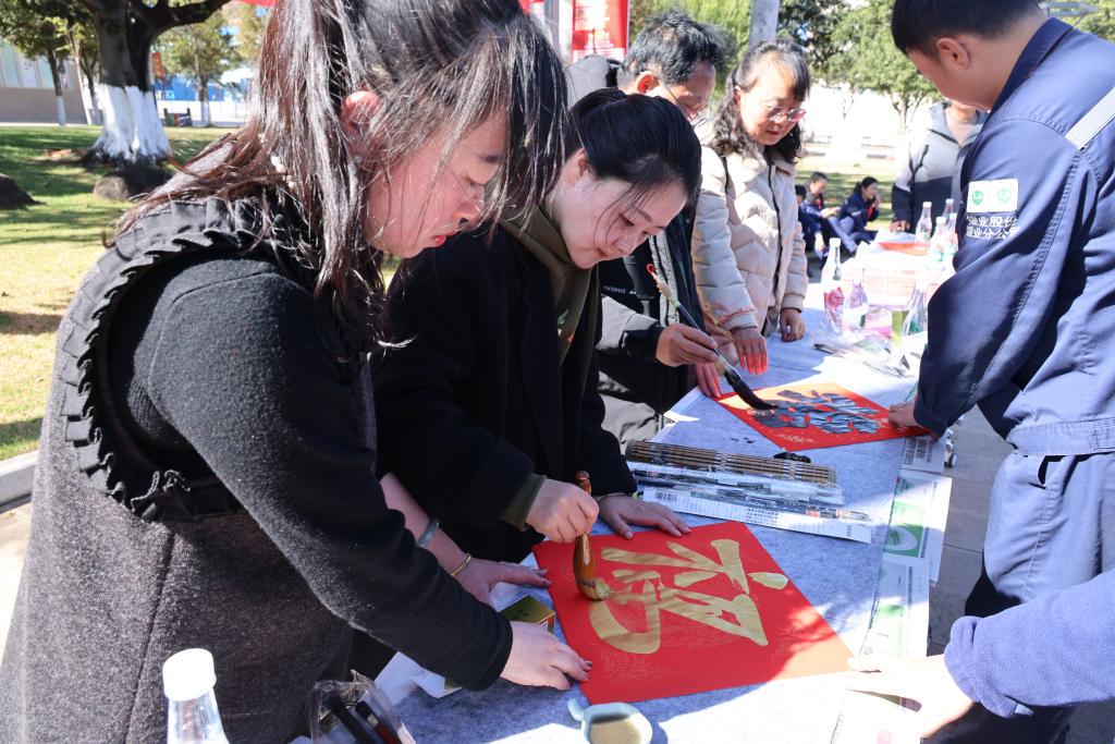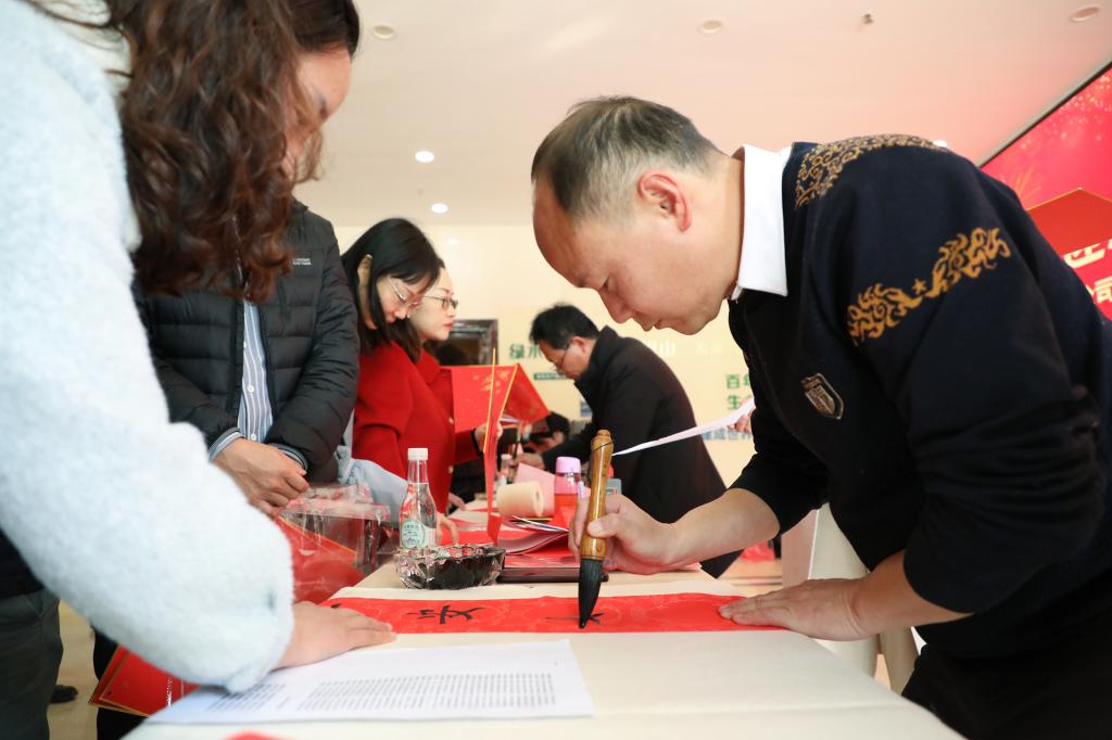 此次活動(dòng)特別邀請(qǐng)中國(guó)書(shū)法家協(xié)會(huì)會(huì)員、紅河州書(shū)法家協(xié)會(huì)名譽(yù)主席段冰,云南省美術(shù)家協(xié)會(huì)會(huì)員、云錫文聯(lián)副主席楊雪峰等11名書(shū)法家進(jìn)行現(xiàn)場(chǎng)創(chuàng)作。他們鋪開(kāi)紅紙、凝神聚氣,以精湛的技藝揮毫潑墨、運(yùn)筆如飛,書(shū)寫(xiě)出一幅幅飽含美好祝福的春聯(lián)和“福”字,把最誠(chéng)摯的新春祝愿獻(xiàn)給干部職工。