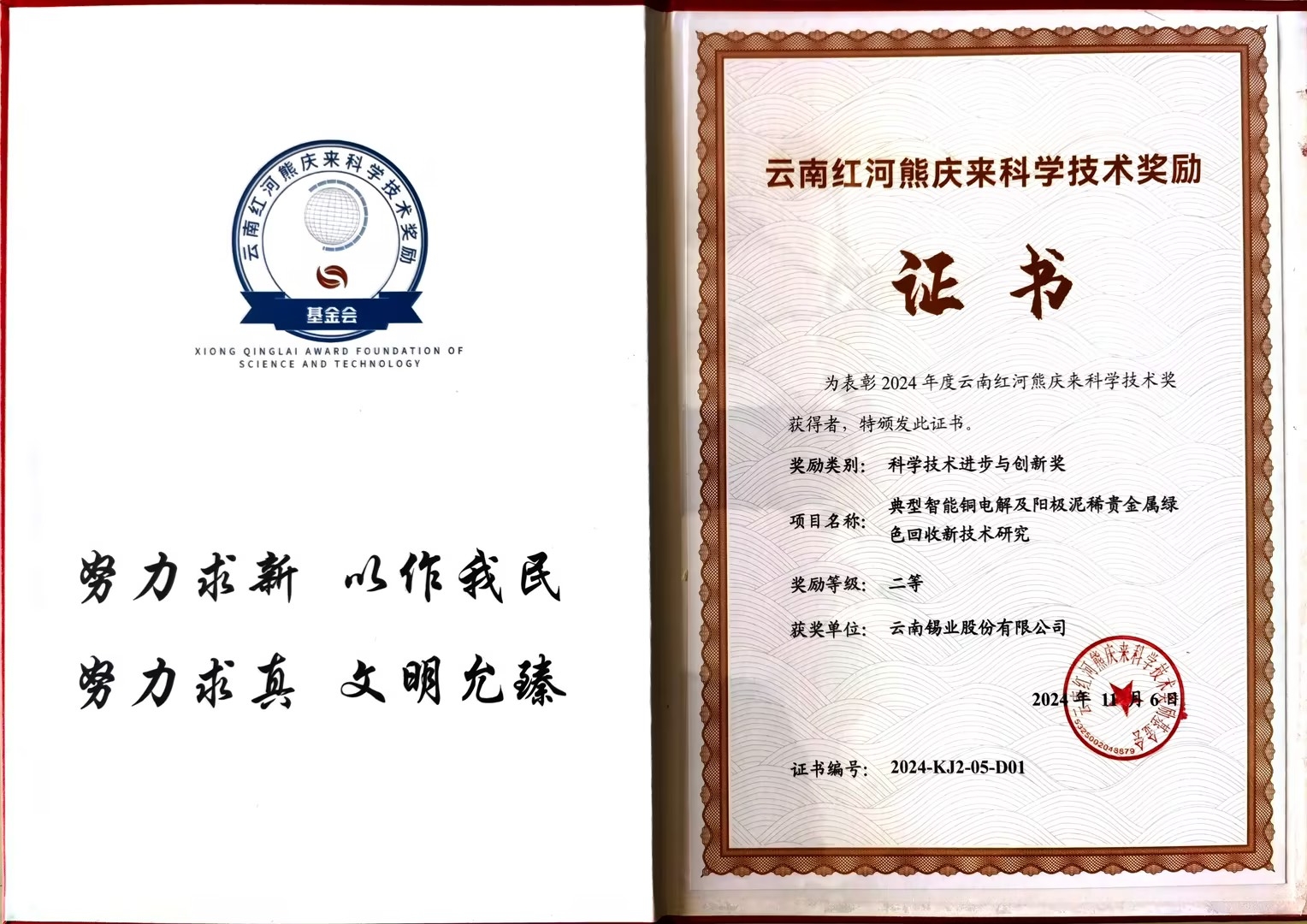 2月19日,紅河州科技大會在蒙自舉行,表彰2024年度云南紅河熊慶來科學技術獎。銅業分公司“典型智能銅電解及陽極泥稀貴金屬綠色回收新技術研究”成果獲熊慶來科學技術進步與創新二等獎。