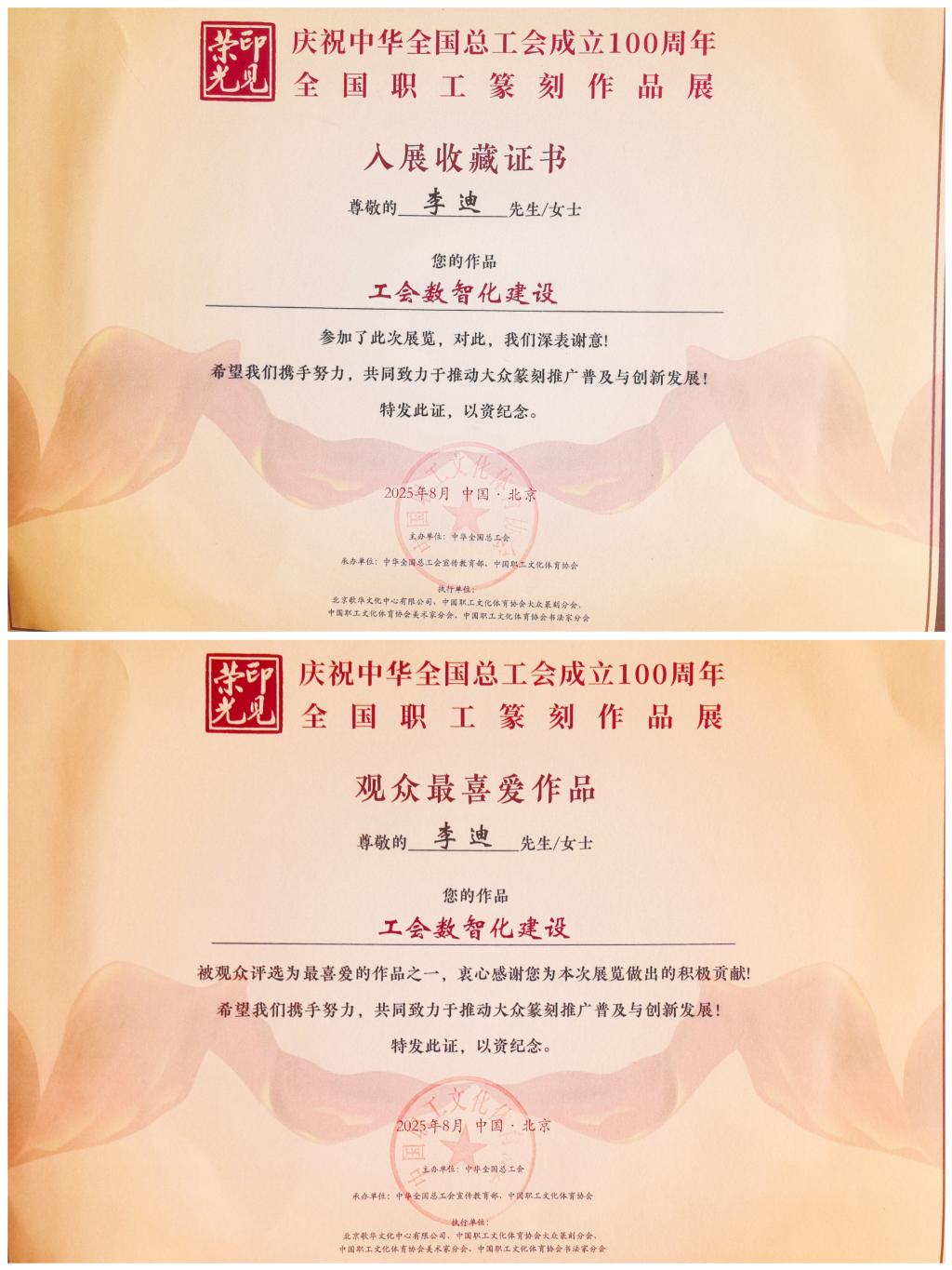 錫筆生輝頌百年工運(yùn)。近日,由控股公司工會(huì)選送的錫都實(shí)業(yè)公司李迪篆刻作品《工會(huì)數(shù)智化建設(shè)》成功入選“印見榮光”中華全國總工會(huì)成立100周年全國職工篆刻作品展,并獲評(píng)觀眾最喜愛作品之一,成為全國工會(huì)系統(tǒng)數(shù)智化建設(shè)成果的藝術(shù)縮影。