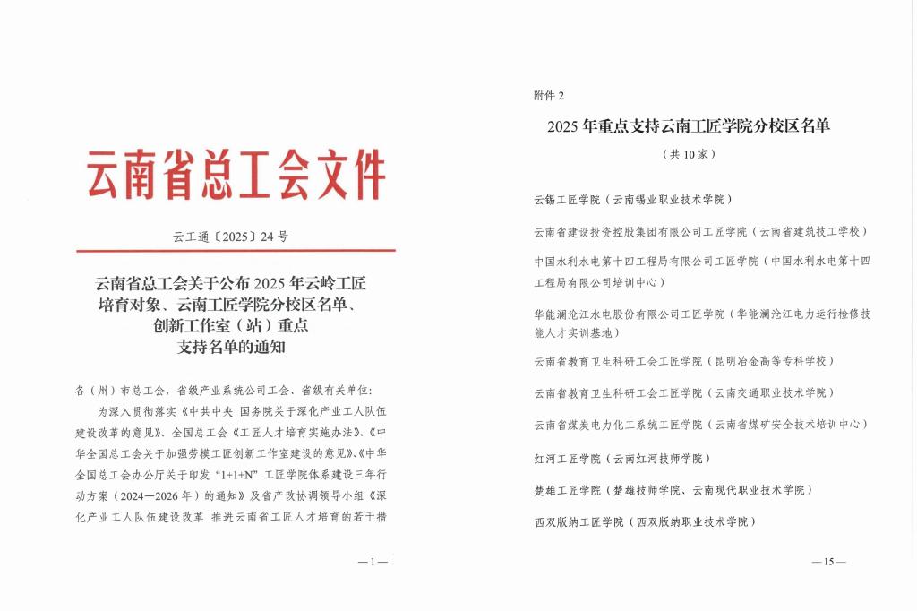 2025年12月29日,云南省總工會公布2025年云南工匠學院分校區名單,云錫工匠學院成功入選,成為全省獲重點支持的十家工匠學院之一。