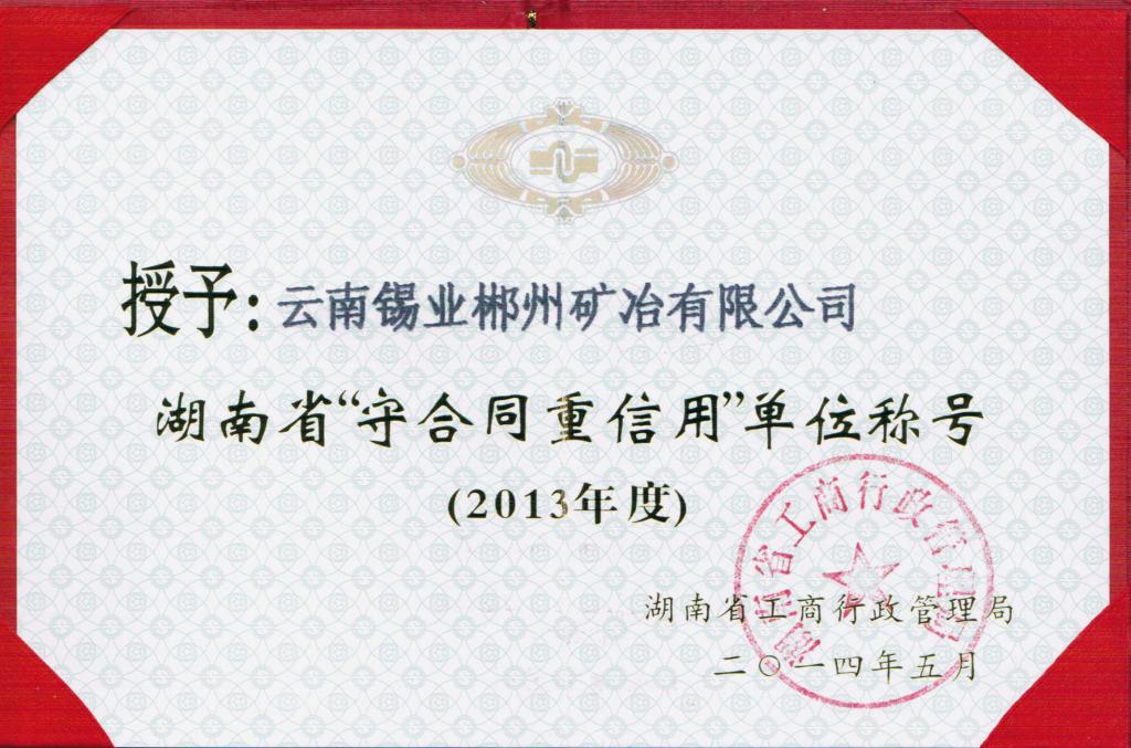 近日,云錫郴州公司被湖南省工商行政管理局授予2013年度湖南省“守合同重信用”單位榮譽稱號。