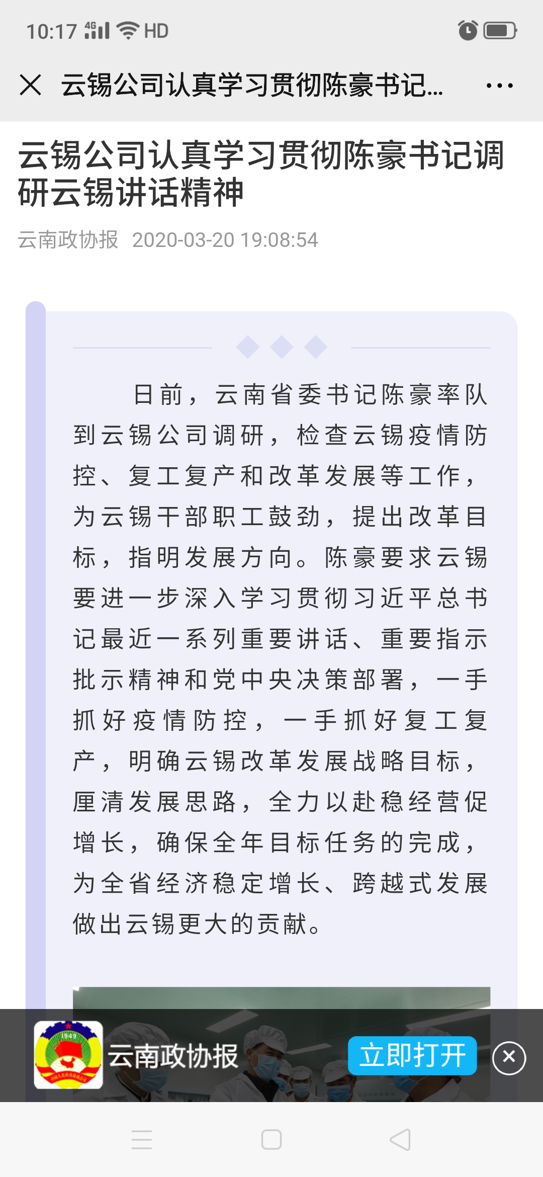 云錫機械公司黨委認為,省委書記陳豪在全省疫情防控的關鍵時期來到云錫,充分肯定了云錫在疫情防控中主動擔當作為、及早果斷采取措施的做法,讓大家備受鼓舞,進一步堅定了全司上下打贏防控疫情阻擊戰的信心和決心,更為云錫改革發展、疫情防控和復工復產工作指明了方向。機械公司黨委將團結帶領全體干部職工,統籌推進疫情防控、復工復產、改革發展和從嚴管黨治黨工作,努力為云錫實現高質量發展作出新的更大貢獻。