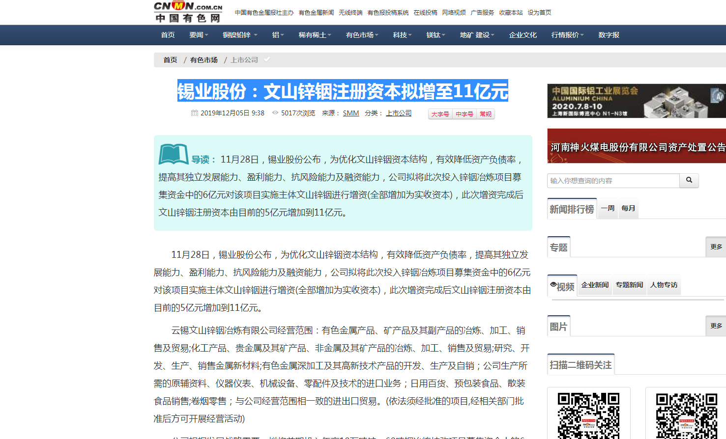 11月28日,錫業股份公布,為優化文山鋅銦資本結構,有效降低資產負債率,提高其獨立發展能力、盈利能力、抗風險能力及融資能力,公司擬將此次投入鋅銦冶煉項目募集資金中的6億元對該項目實施主體文山鋅銦進行增資(全部增加為實收資本),此次增資完成后文山鋅銦注冊資本由目前的5億元增加到11億元。