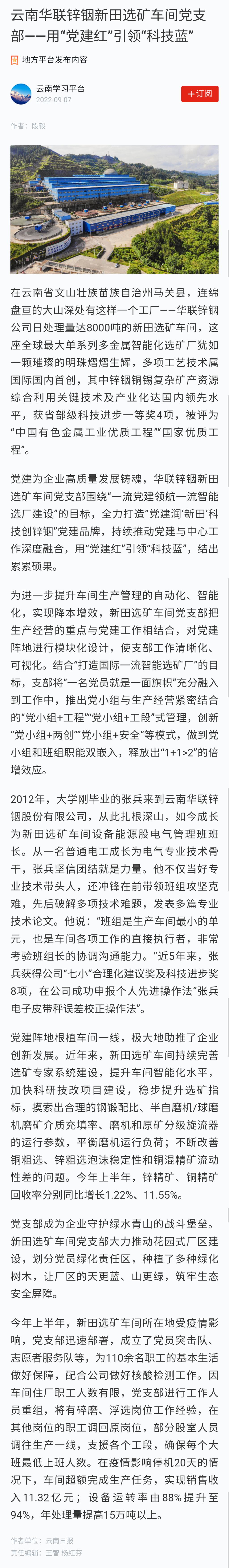學習強國:云南華聯鋅銦新田選礦車間黨支部——用“黨建紅”引領“科技藍”