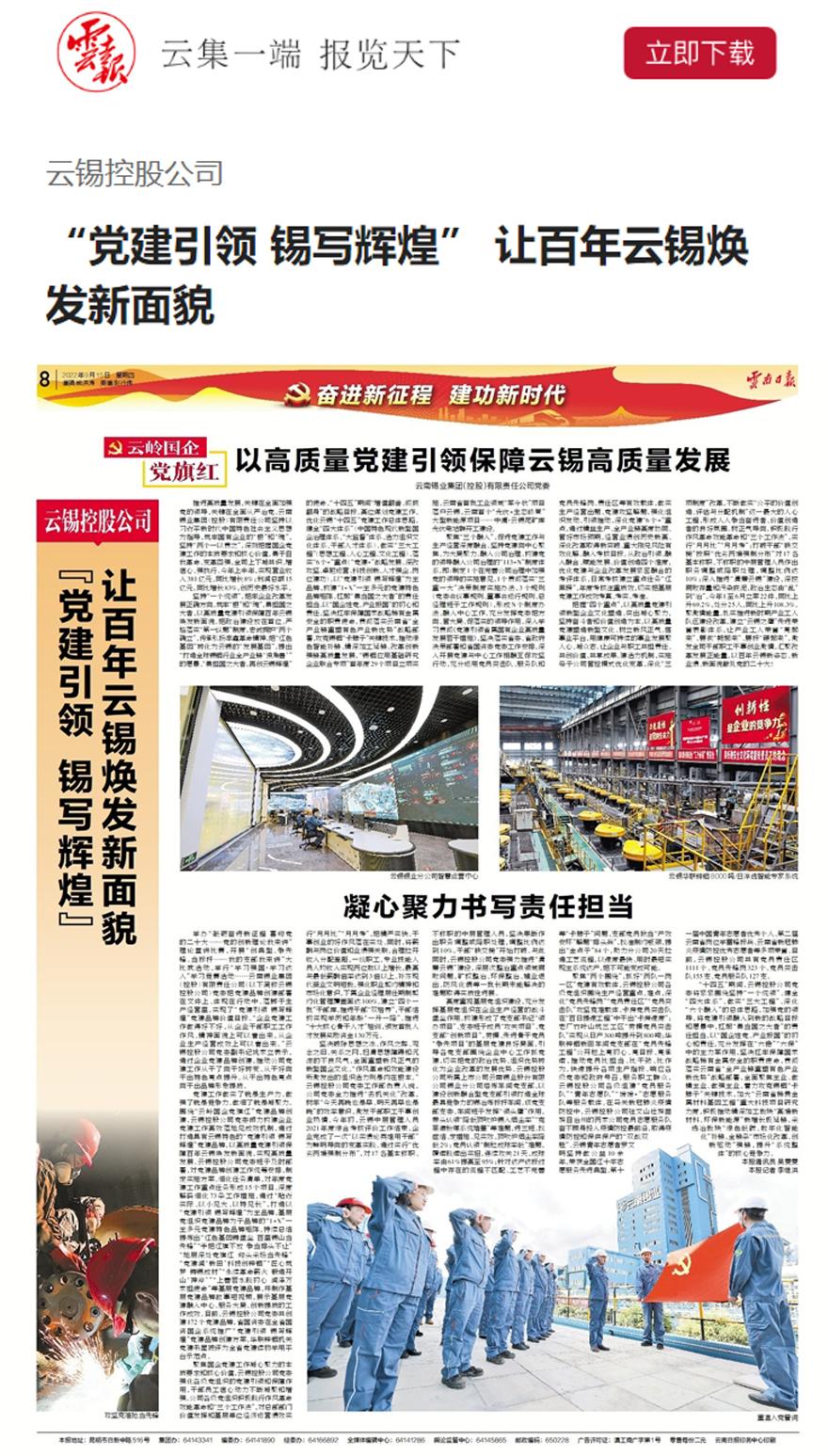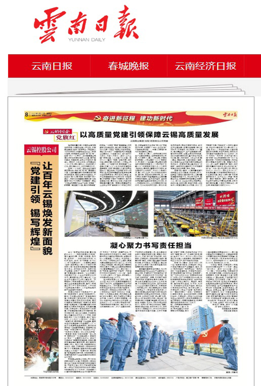 “十四五”期間,云錫控股公司黨委將緊緊圍繞堅持“一個統領”、健全“四大體系”、做實“三大工程”、深化“六個融入”的總體思路,加強黨的領導,將黨建引領融入到新的戰略目標和愿景中,扛起“勇當國之大者”的責任擔當,以“國企姓黨、產業報國”的初心和責任,充分發揮在“六穩”“六保”中的主力軍作用,堅決扛牢保障國家戰略稀有金屬安全的職責使命,貫徹落實云南省“全產業鏈重塑有色產業新優勢”戰略部署,全面聚焦主業、做精主業、做強主業,著力攻克錫銦“卡脖子”關鍵技術,加大“云南省稀貴金屬材料基因工程”重大科技項目研究力度,積極推動精深加工板塊“高端新材料、環保新能源”新增長極延鏈,采選冶板塊“綠色低碳、數字化智能化”補鏈,全鏈條“市場化改革、創新驅動”強鏈,提升“系統整體”的核心競爭力。(本報通訊員 吳雯雯 本報記者 李繼洪)