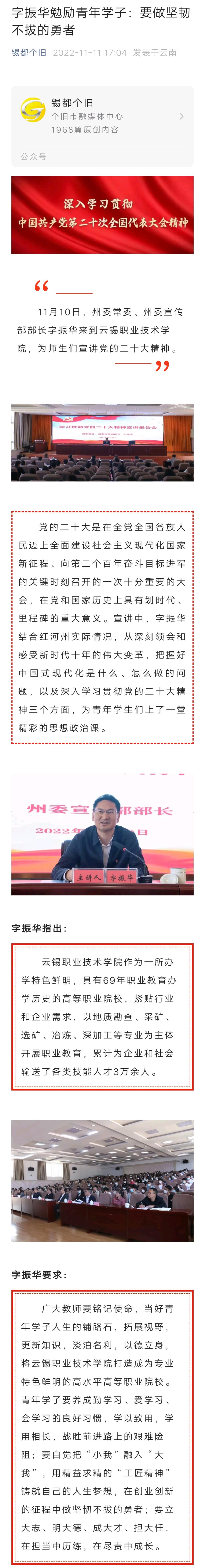錫都個舊:紅河州委宣傳部部長字振華到職業學院宣講黨的二十大精神