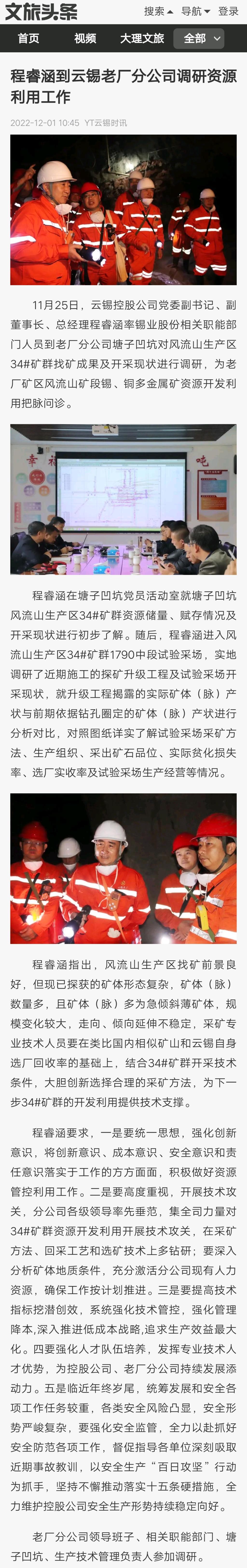 文旅頭條:程睿涵到云錫老廠分公司調研資源利用工作