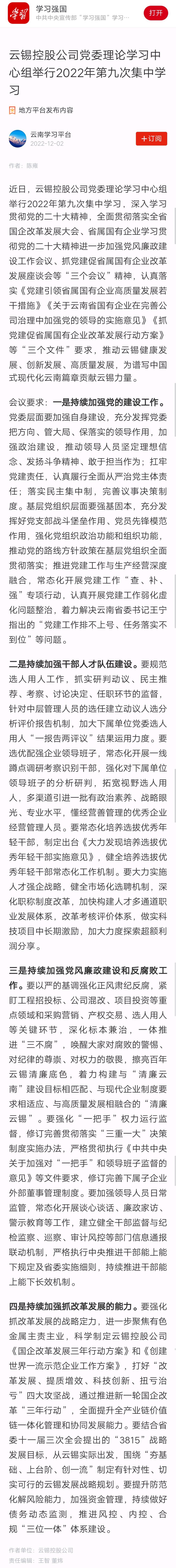 學(xué)習(xí)強(qiáng)國:云錫控股公司黨委理論學(xué)習(xí)中心組舉行2022年第九次集中學(xué)習(xí)