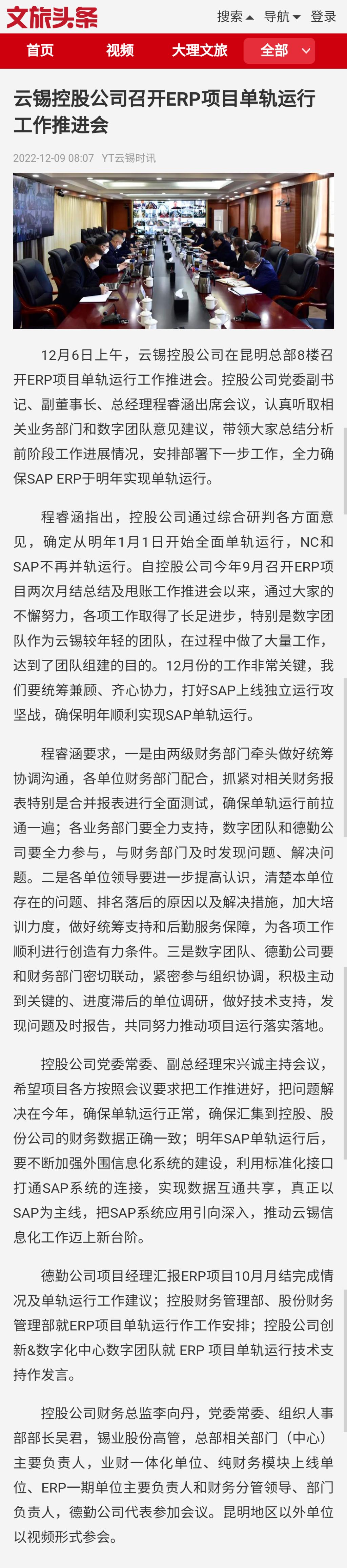 文旅頭條:云錫控股公司召開ERP項目單軌運行工作推進會