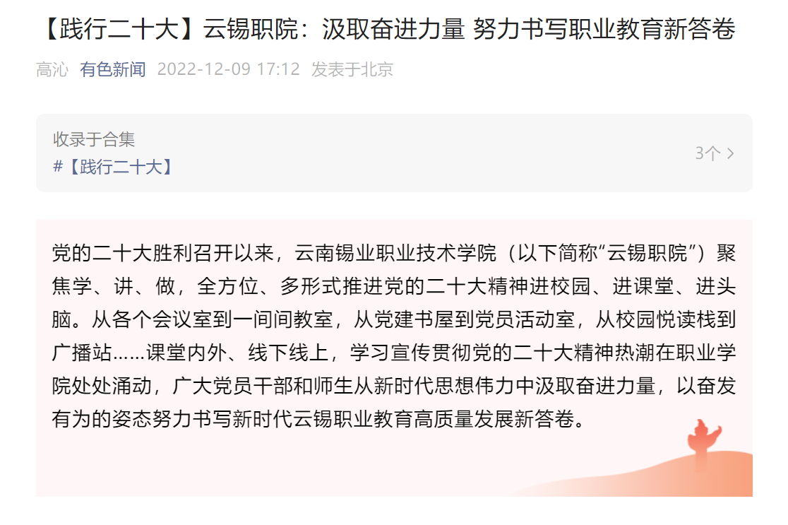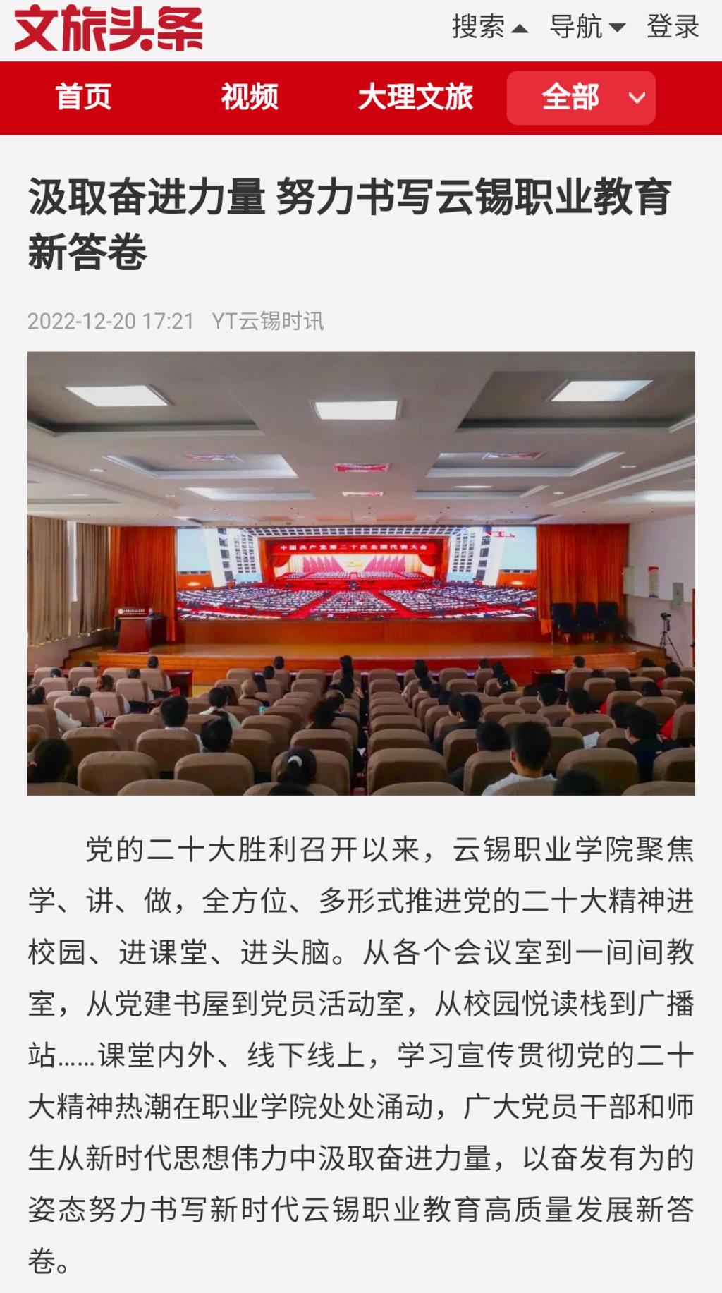 中國有色金屬報、有色新聞、文旅頭條:云錫職院汲取奮進力量 努力書寫職業教育新答卷