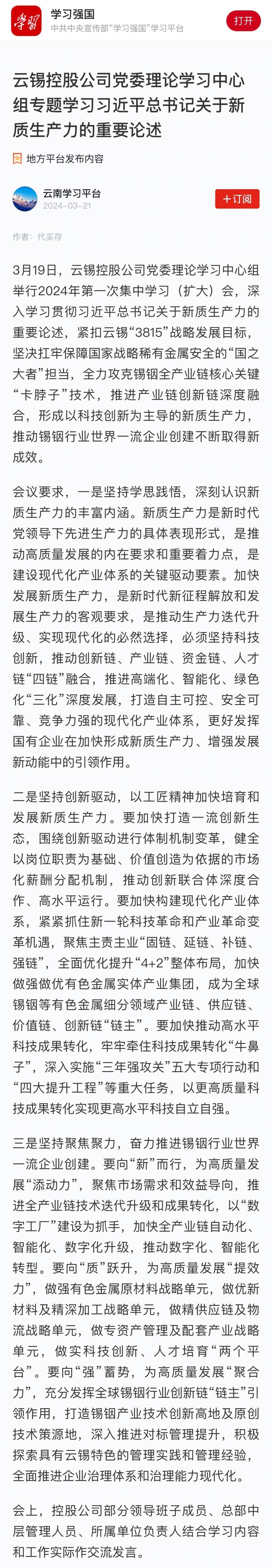 學習強國:云錫控股公司黨委理論學習中心組專題學習習近平總書記關于新質生產力的重要論述