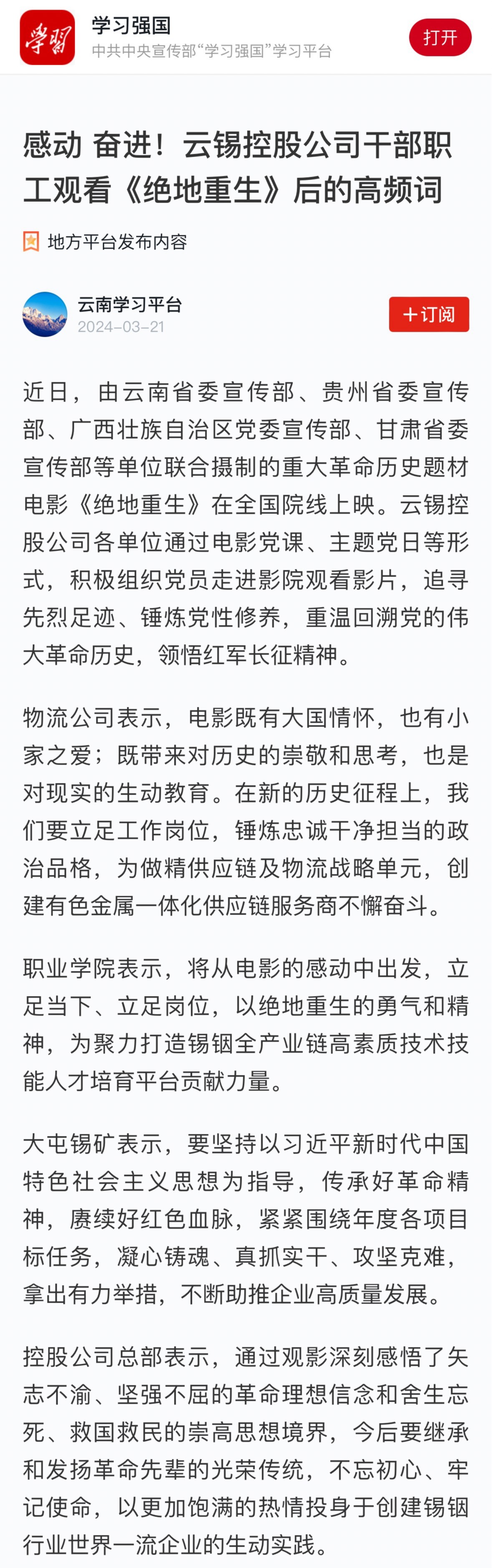 學(xué)習(xí)強(qiáng)國:感動 奮進(jìn)!云錫控股公司干部職工觀看《絕地重生》后的高頻詞