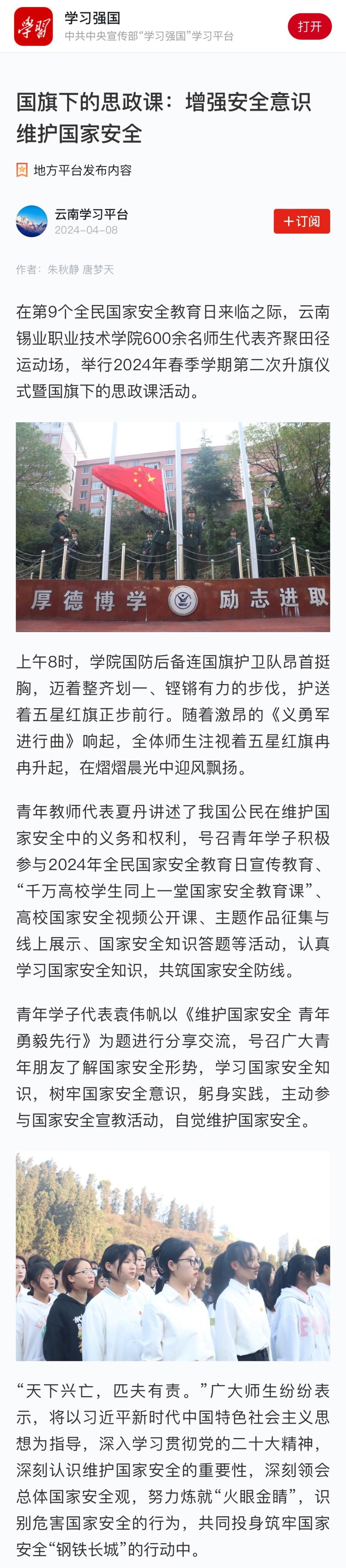 學習強國:【國旗下的思政課】增強安全意識 維護國家安全