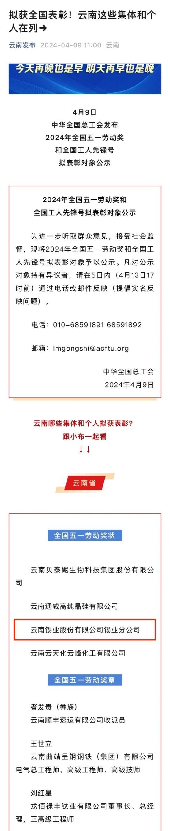 云南發布:錫業分公司擬獲“全國五一勞動獎狀”