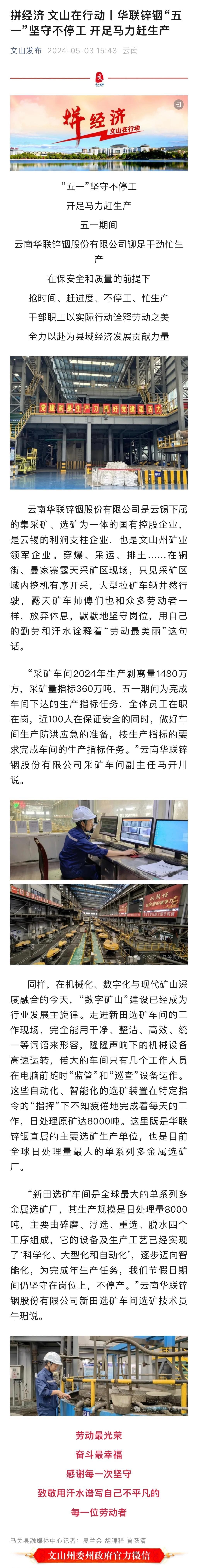 文山發布:華聯鋅銦“五一”堅守不停工 開足馬力趕生產
