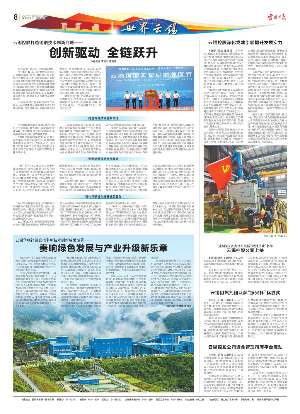 錨定云南“3815”戰略發展目標,云錫控股公司黨委正立足錫銦資源稟賦和產業優勢,以創新驅動錫、銦全產業鏈躍升,加速創建“世界一流企業”。