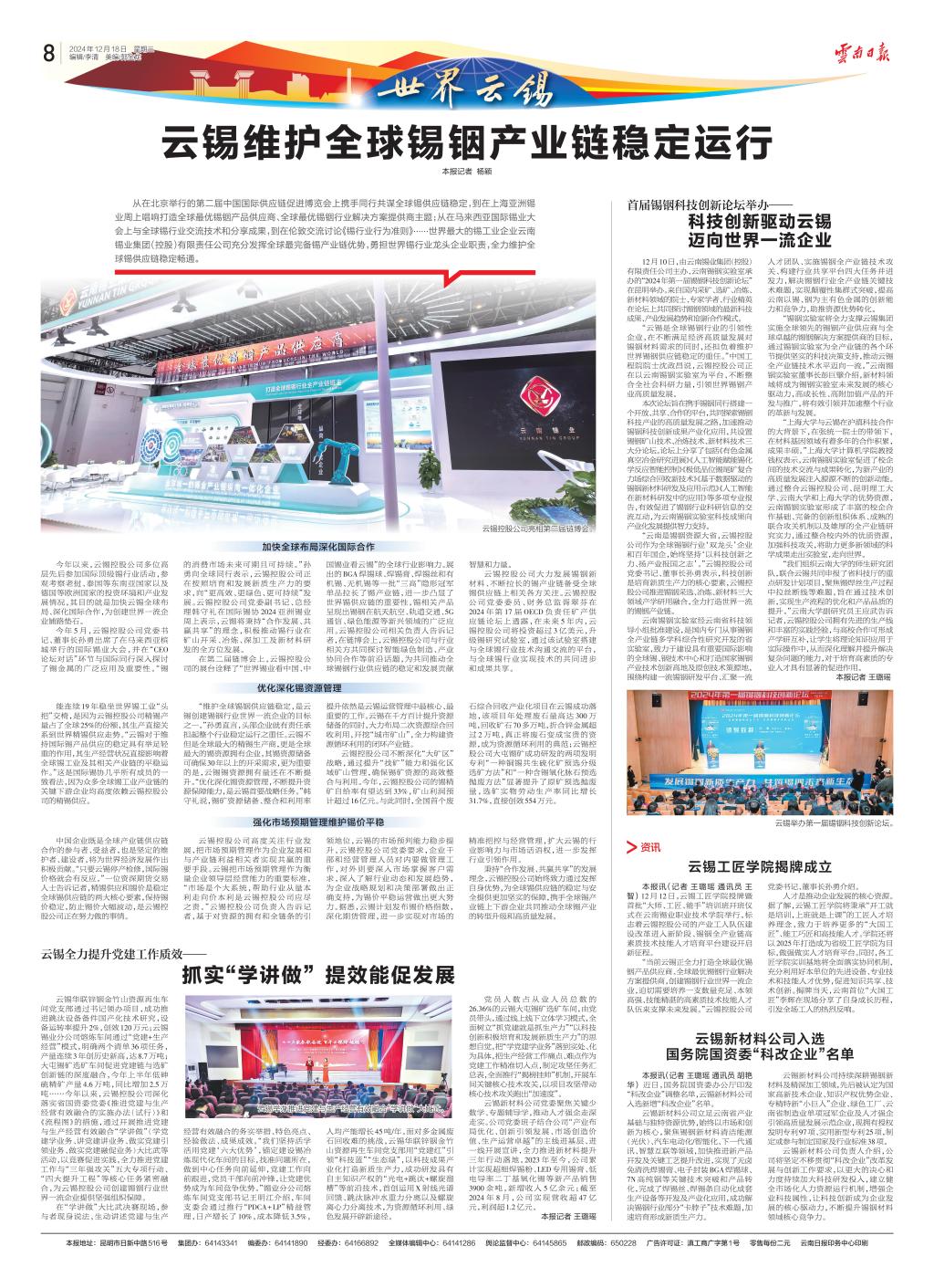 “云南是錫銦資源大省,云錫控股公司作為全球錫銦行業(yè)‘雙龍頭’企業(yè)和百年國企,始終堅持‘以科技創(chuàng)新之力、揚產(chǎn)業(yè)報國之志’。”云錫控股公司黨委書記、董事長孫勇表示,科技創(chuàng)新是培育新質(zhì)生產(chǎn)力的核心要素,云錫控股公司推進錫銦采選、冶煉、新材料三大領(lǐng)域產(chǎn)學研用融合,全力打造世界一流的錫銦產(chǎn)業(yè)鏈。