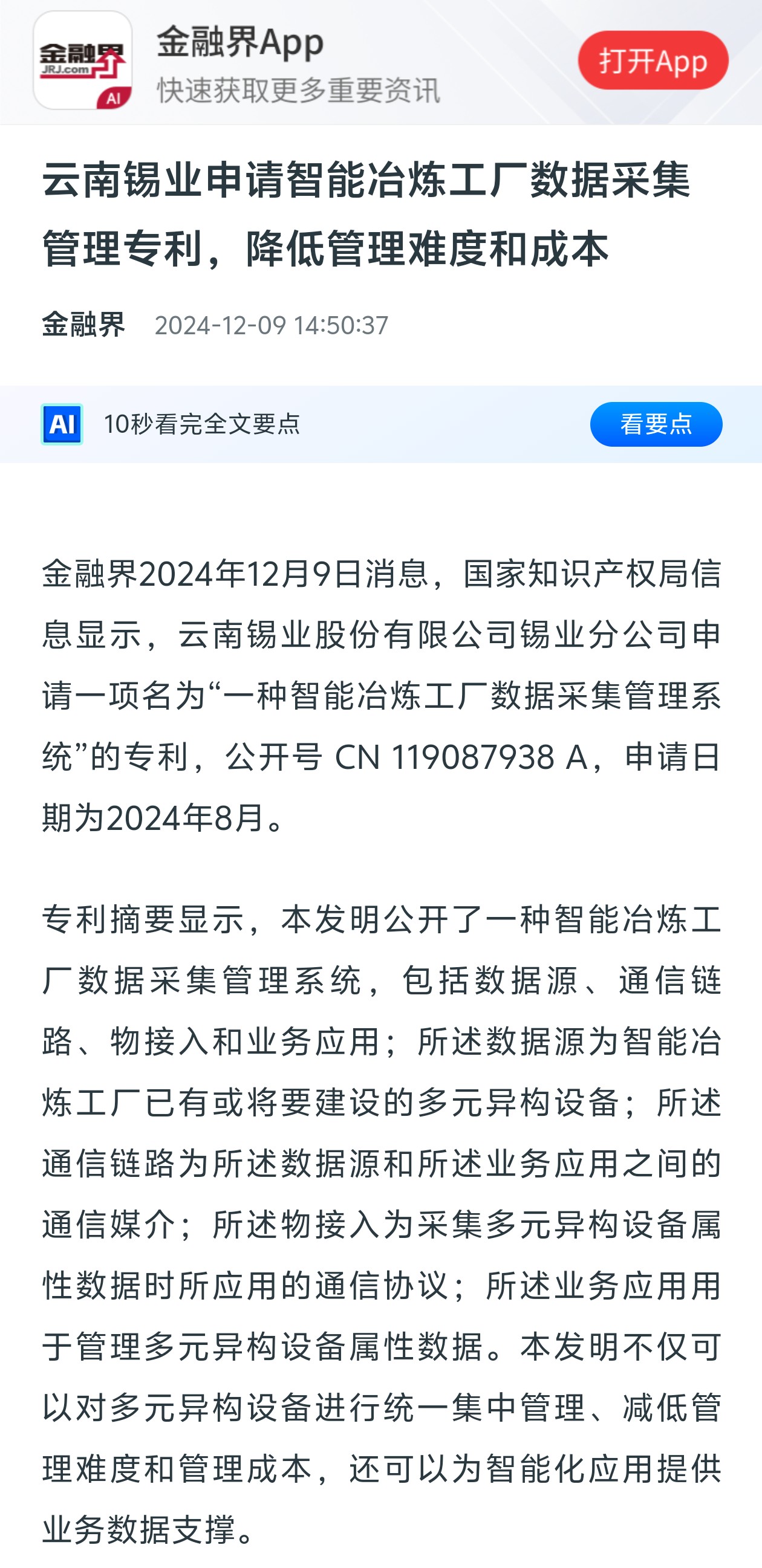 金融界:云南錫業(yè)申請(qǐng)智能冶煉工廠數(shù)據(jù)采集管理專利,降低管理難度和成本