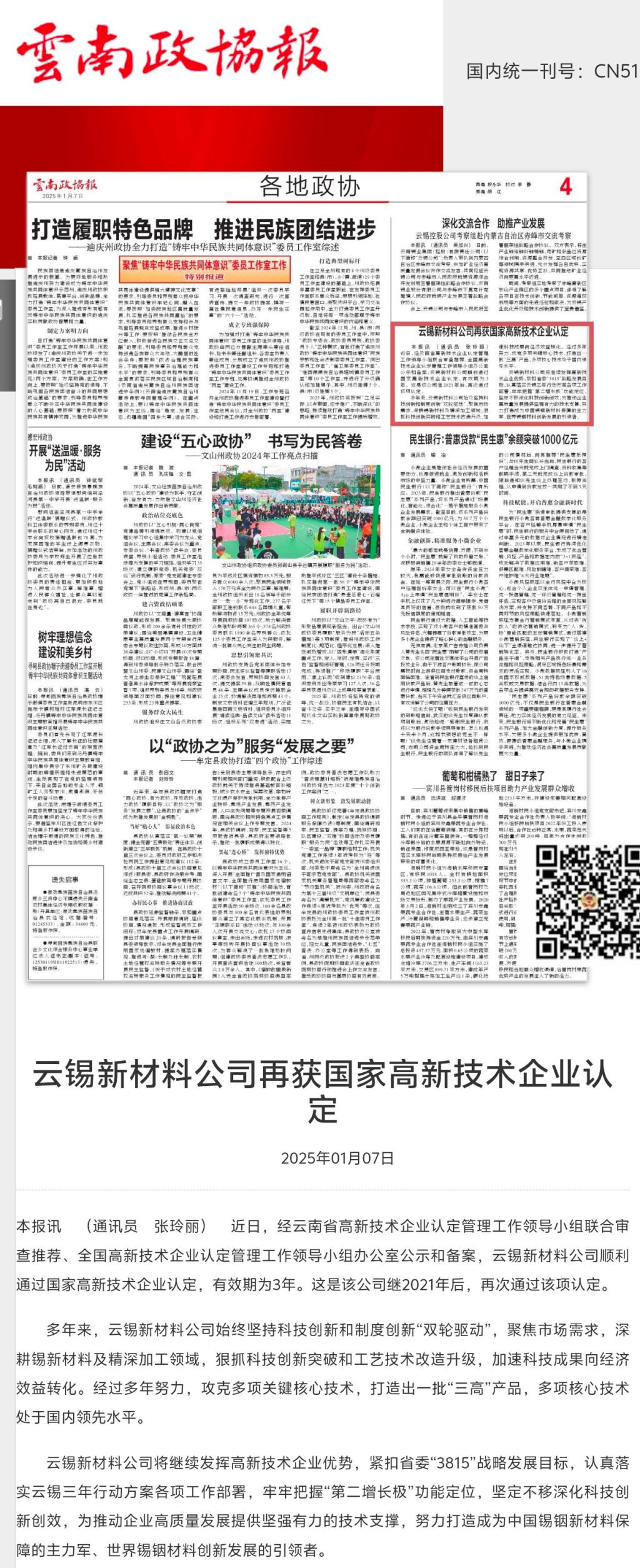 云南政協報:云錫新材料公司再獲國家高新技術企業認定