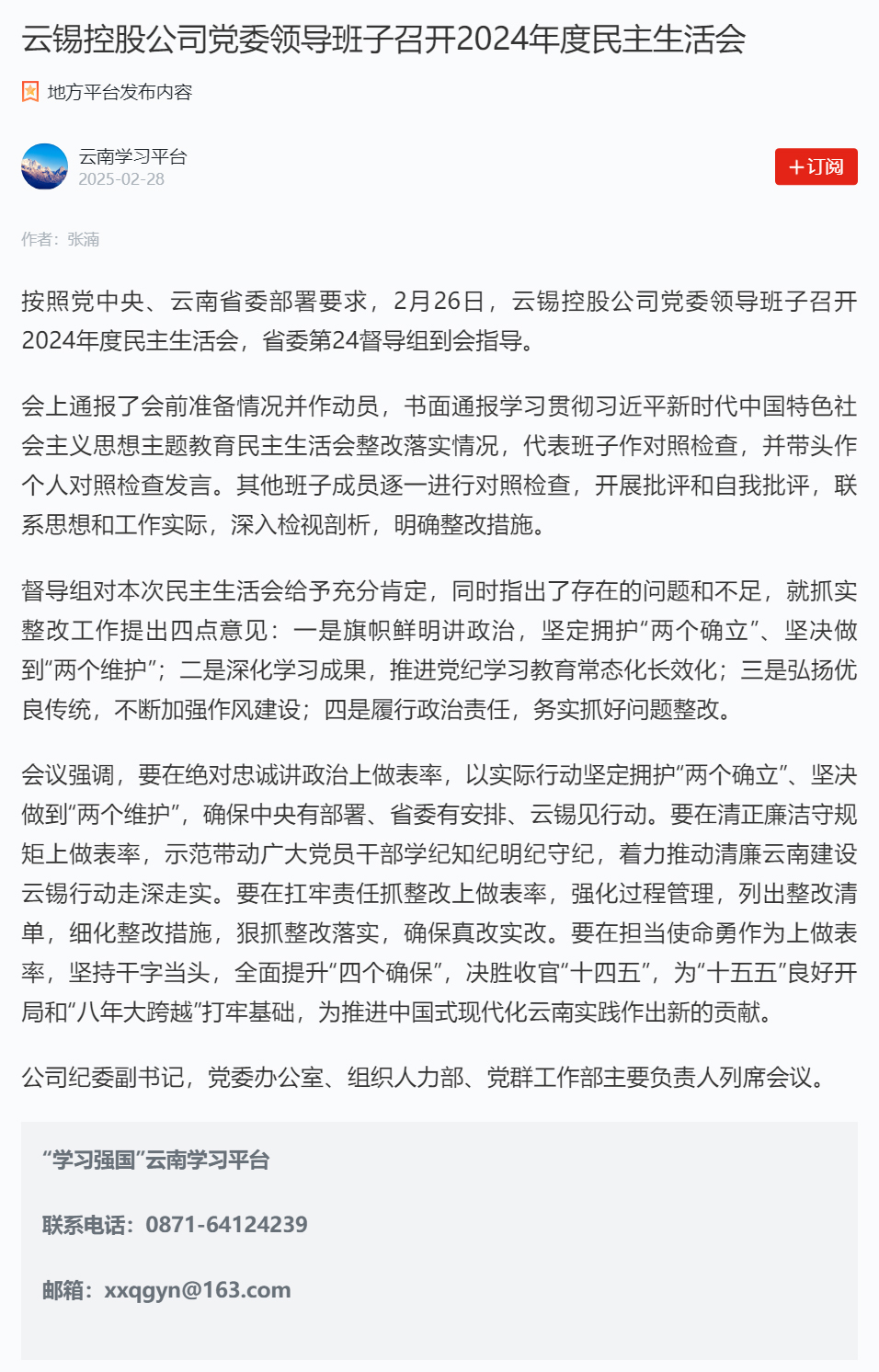 學習強國:云錫控股公司黨委領導班子召開2024年度民主生活會