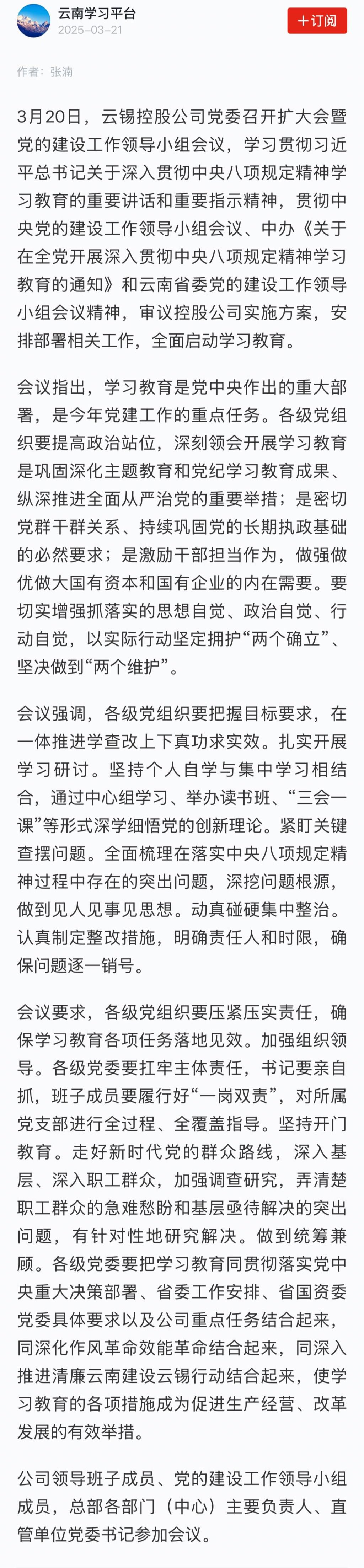 學(xué)習(xí)強國:云錫控股公司黨委安排部署深入貫徹中央八項規(guī)定精神學(xué)習(xí)教育