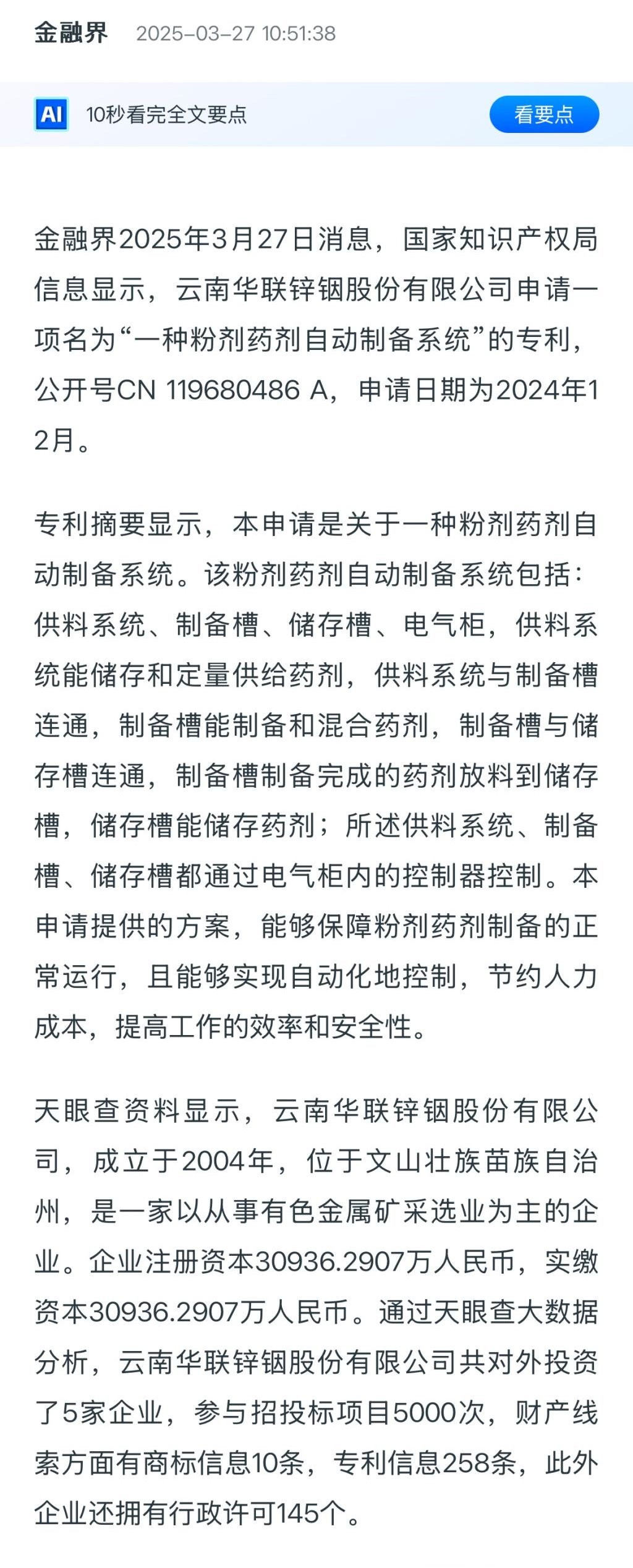 金融界:云南華聯鋅銦申請一種粉劑藥劑自動制備系統專利,實現自動化控制節約人力成本