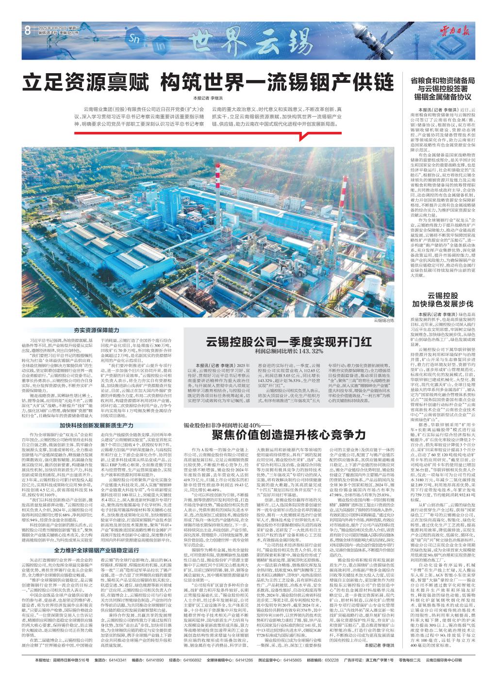 本報訊(記者李繼洪)2025年以來,云錫控股公司把學習好、宣傳好、貫徹好習近平總書記考察云南重要講話精神作為重大政治任務,扎實開展深入貫徹中央八項規定精神學習教育,與控股公司既定的各項目標任務統籌起來,切實把學習成效轉化為牢記囑托、感恩奮進的實際行動。一季度,云錫控股公司實現營業收入112.65億元,利潤總額5.03億元,同比增長143.32%,超計劃76.53%,生產經營實現“開門紅”。