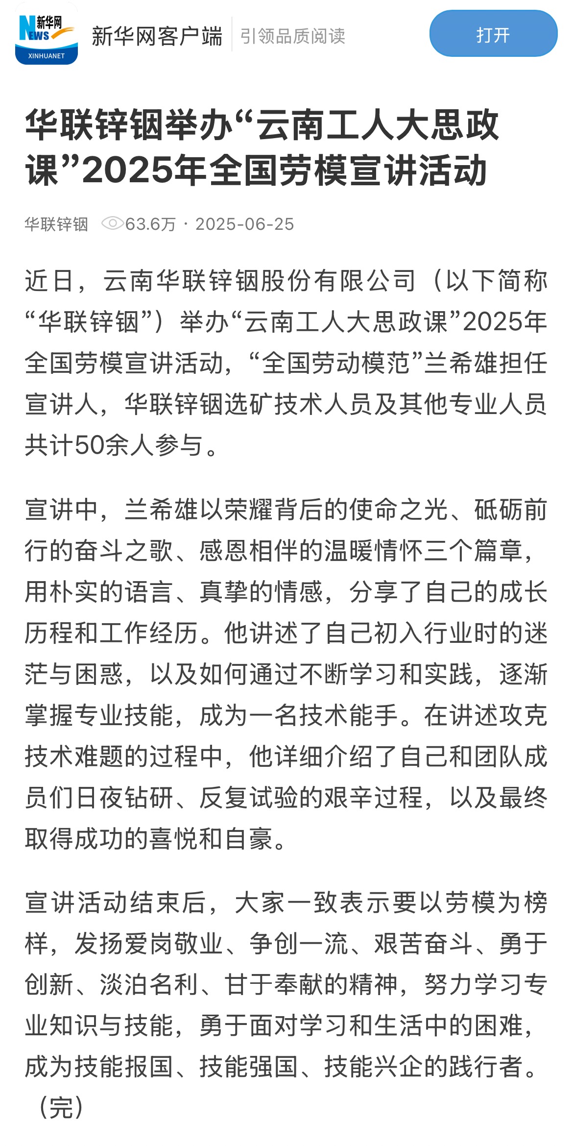 新華網:華聯鋅銦舉辦“云南工人大思政課”2025年全國勞模宣講活動