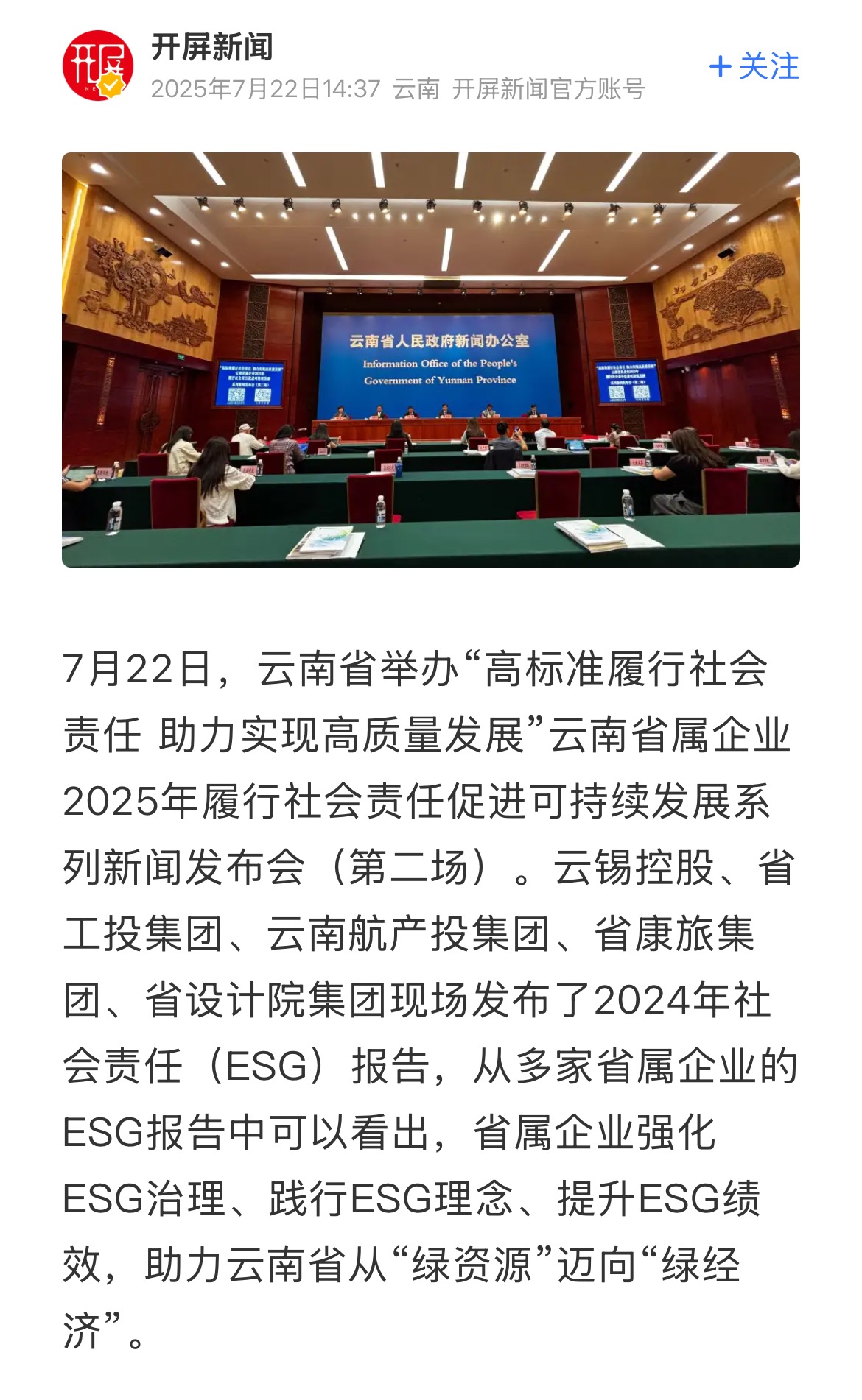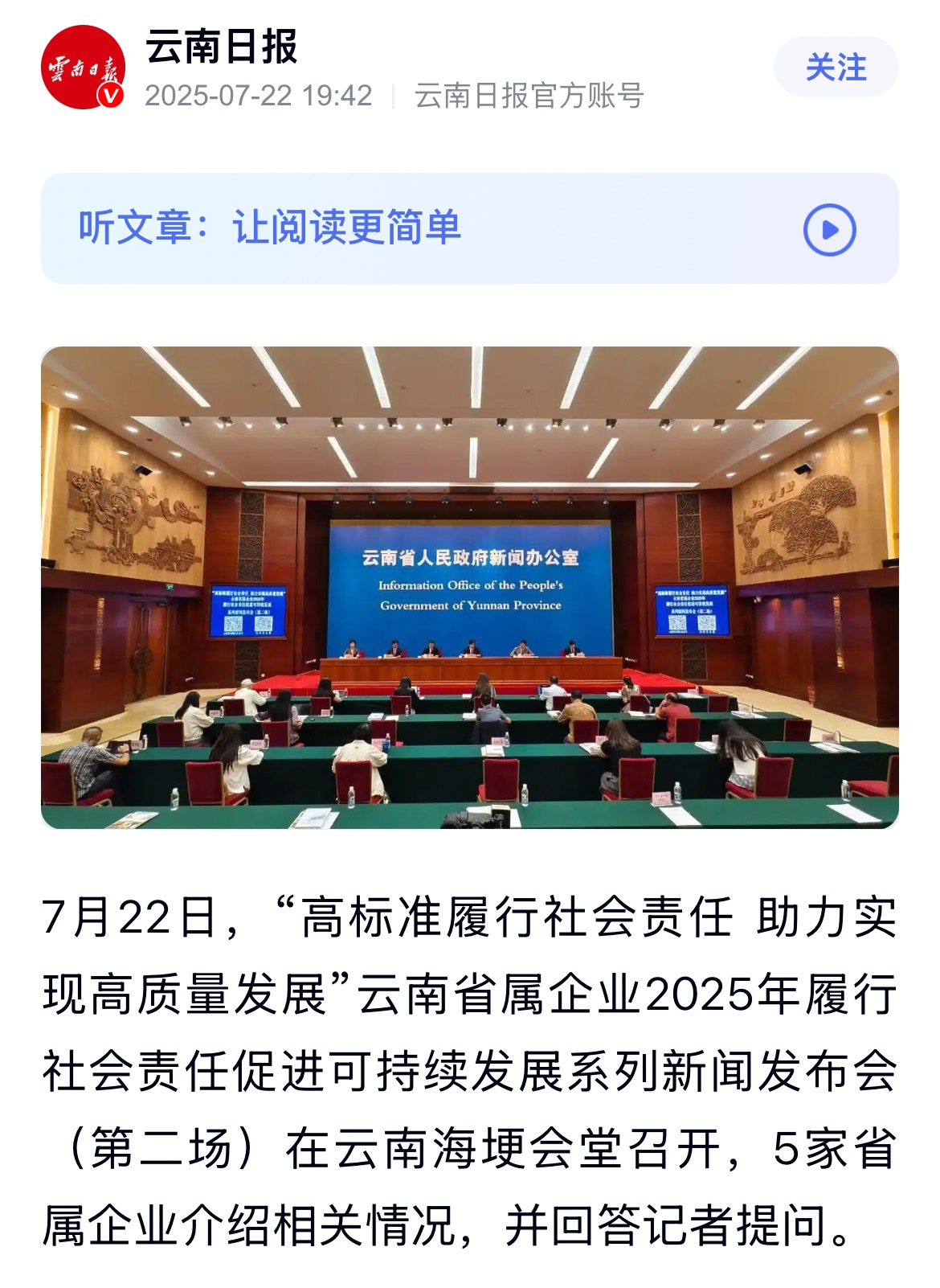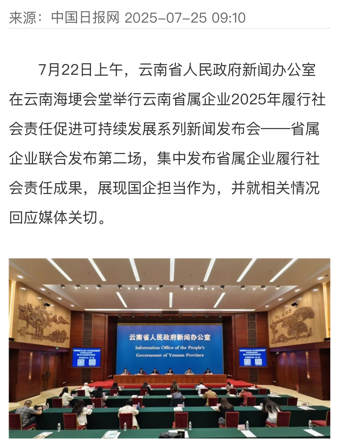 鏈接:(央廣網)、(央視影音)、(新華網)、(新華時訊)、(中國日報網)、(中國新聞網)、(中國網)(云南新聞聯播)、(云南衛視晚間新聞)、(云南發布)、(云南日報)、(云南日報-云新聞)、(云南網)、(七彩云端)、(云南省人民政府)、(云嶺先鋒網)、(云南國資)、(云南政協報)、(有色金屬報)、(有色新聞)、(騰訊新聞)、(今日頭條)、(搜狐)、(網易)、(新浪微博)、(新浪財經)、(都市時報)、(國泰君安)、(昆明日報)、(春城晚報)、(昆明信息港)、(開屏新聞)