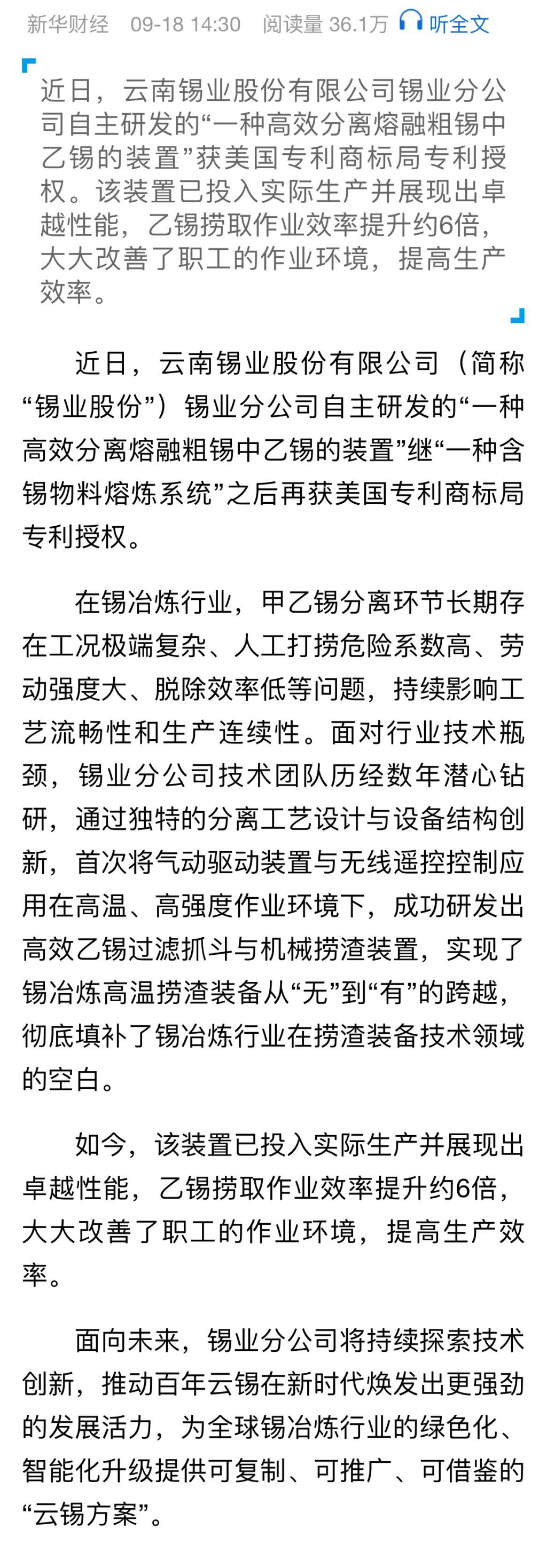 新華財經:錫業分公司創新成果再獲美國專利商標局授權