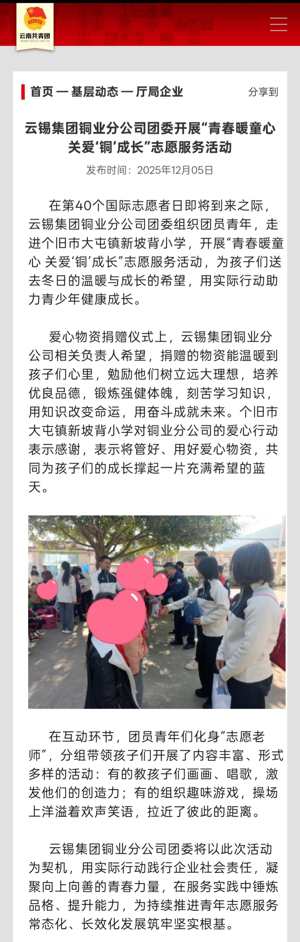 云南共青團:云錫集團銅業分公司團委開展“青春暖童心 關愛‘銅’成長”志愿服務活動
