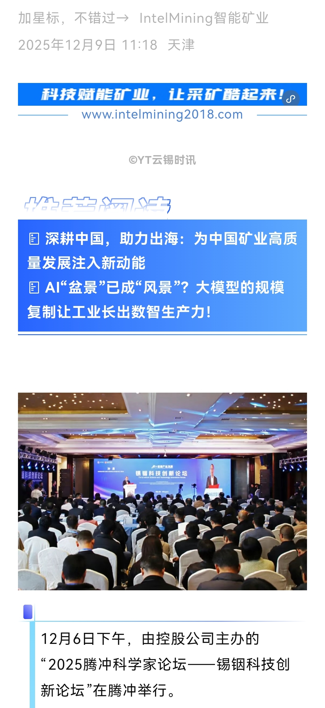 鏈接:(云南日報)、(云南省科學技術院)、(騰沖發布)、(騰沖科學家論壇)、(IntelMining智能礦業)、(科技彩云南)、(有色新聞)