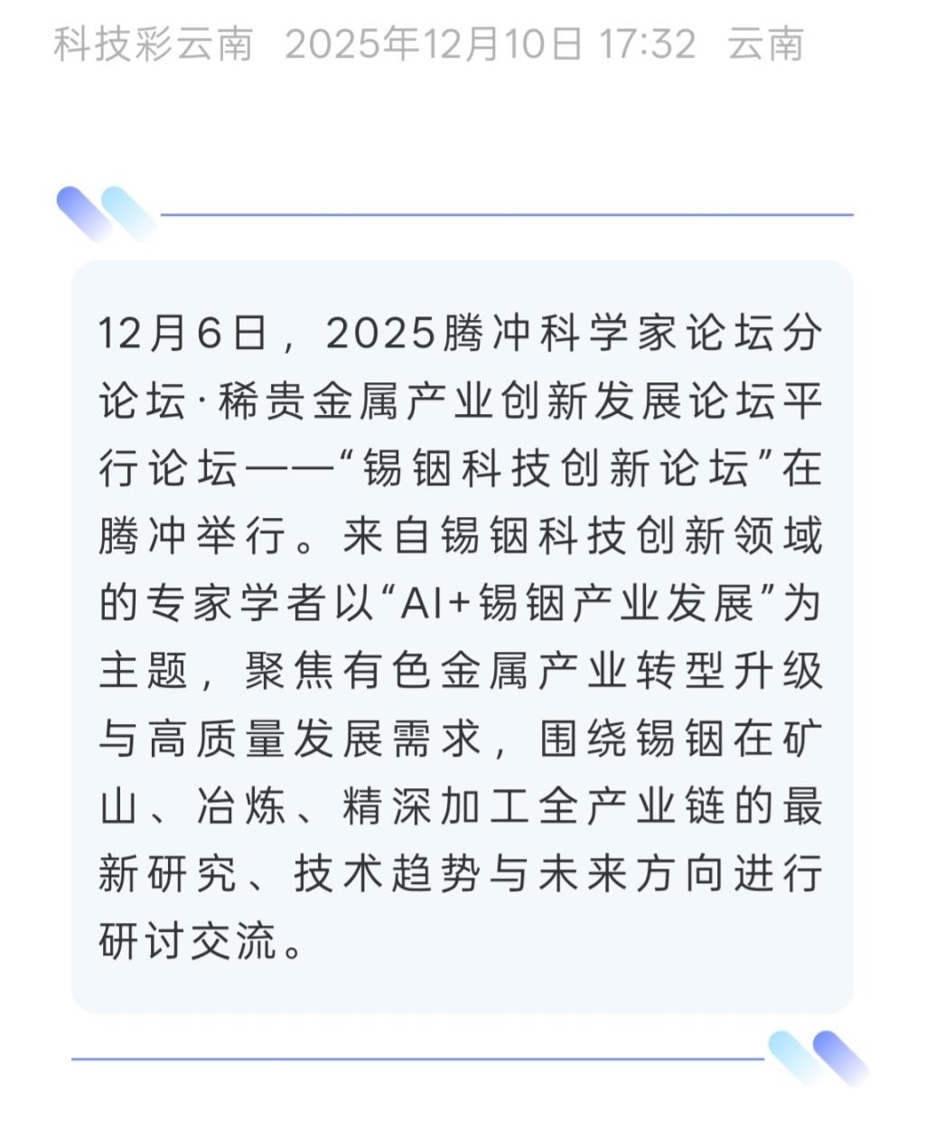 來源:云南日報、云南省科學技術院、騰沖發布、騰沖科學家論壇、IntelMining智能礦業、科技彩云南、有色新聞