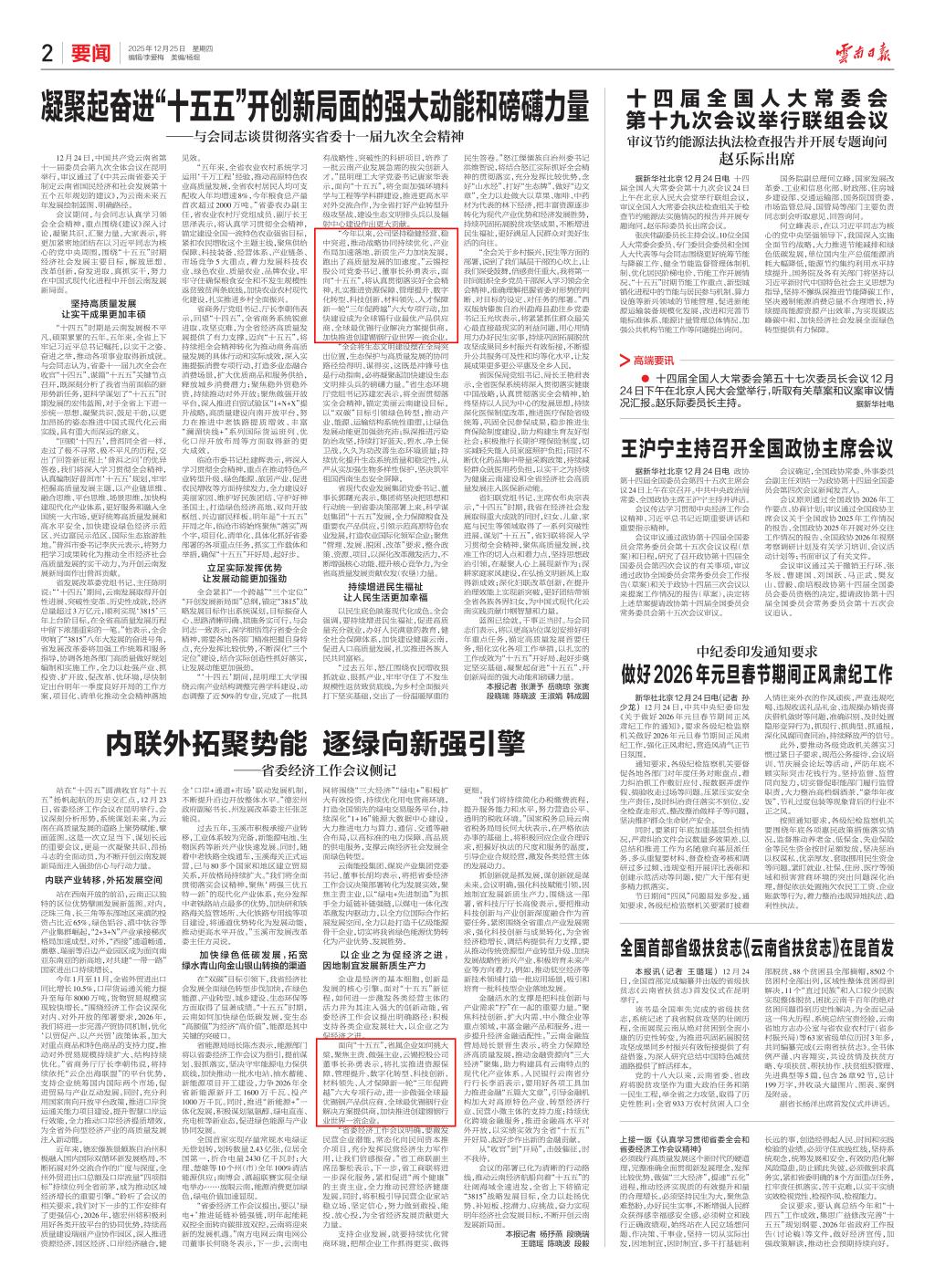 站在“十四五”圓滿收官與“十五五”揚帆起航的歷史交匯點,12月23日,省委經(jīng)濟工作會議在昆明舉行。會議深刻分析形勢,系統(tǒng)謀劃未來,為云南在高質量發(fā)展的道路上聚勢賦能、擘畫藍圖。這是一次立足當下、謀劃長遠的重要會議,更是一次凝聚共識、昂揚斗志的全面動員,為不斷開創(chuàng)云南發(fā)展新局面注入強勁信心與行動力量。
