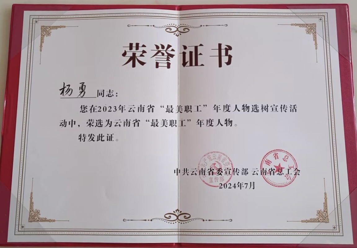 喜報傳佳音,奮楫正當時。7月15日,省委宣傳部、省總工會在云南廣播電視臺舉行云南省“最美職工”年度人物發(fā)布儀式,發(fā)布2023年云南省“最美職工”年度人物先進事跡。老廠分公司職工楊勇光榮在榜。