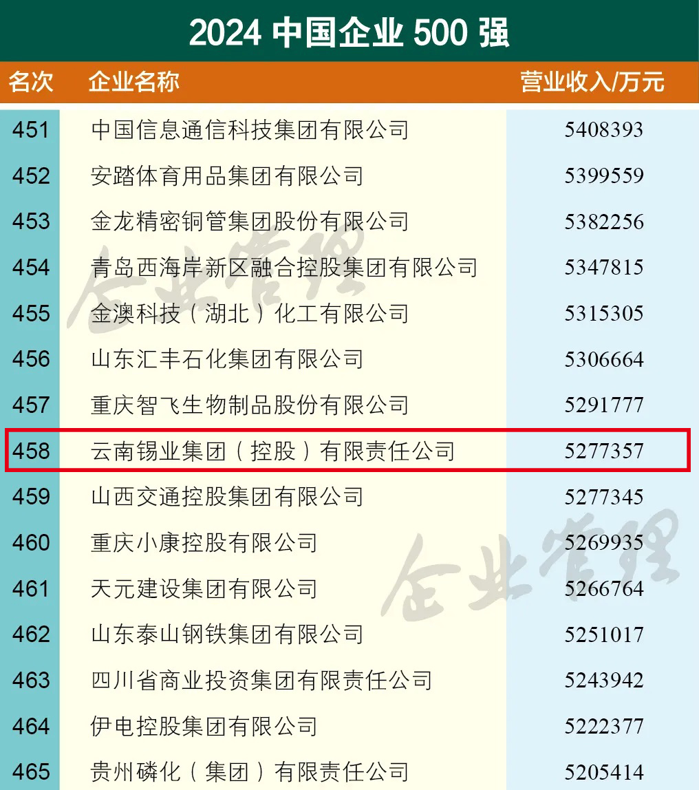 日前,中國(guó)企業(yè)聯(lián)合會(huì)、中國(guó)企業(yè)家協(xié)會(huì)聯(lián)合發(fā)布2024中國(guó)企業(yè)500強(qiáng)、中國(guó)制造業(yè)企業(yè)500強(qiáng)榜單。云錫位列2024中國(guó)企業(yè)500強(qiáng)第458位、中國(guó)制造業(yè)企業(yè)500強(qiáng)第240位。
