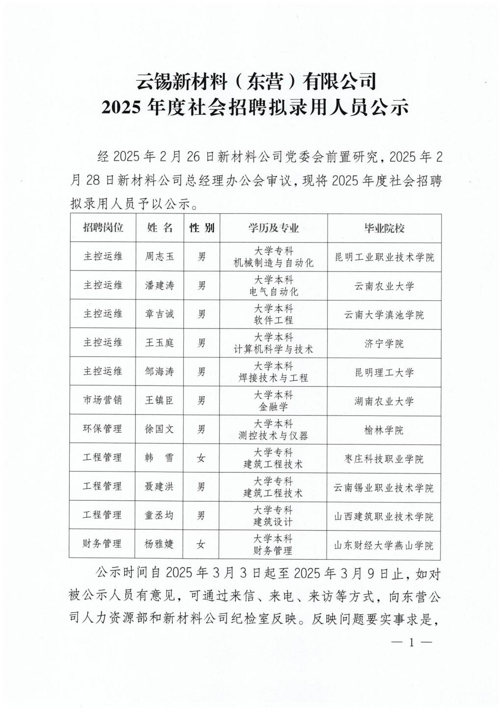 云錫新材料(東營)有限公司2025年度社會招聘擬錄用人員公示